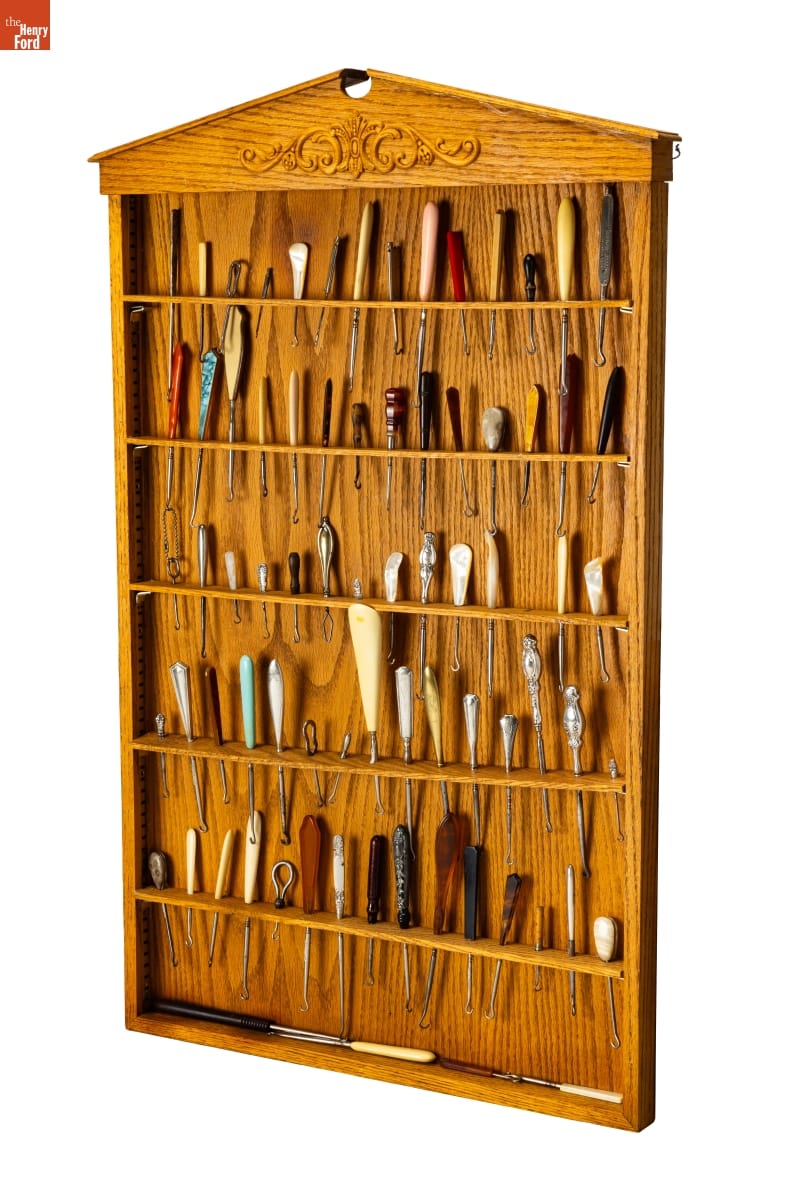 Albert Morris collected buttonhooks. Morris was born with Charcot-Marie-Tooth disease, a degenerative nerve disease that can cause muscle weakness and contracture. In the 1960s, as the disease progressed, he found it more difficult to button his shirts. Morris discovered the buttonhook, an age-old device with a slender hook that pulls a button through a buttonhole. He amassed more than 120, creating this case to display them.