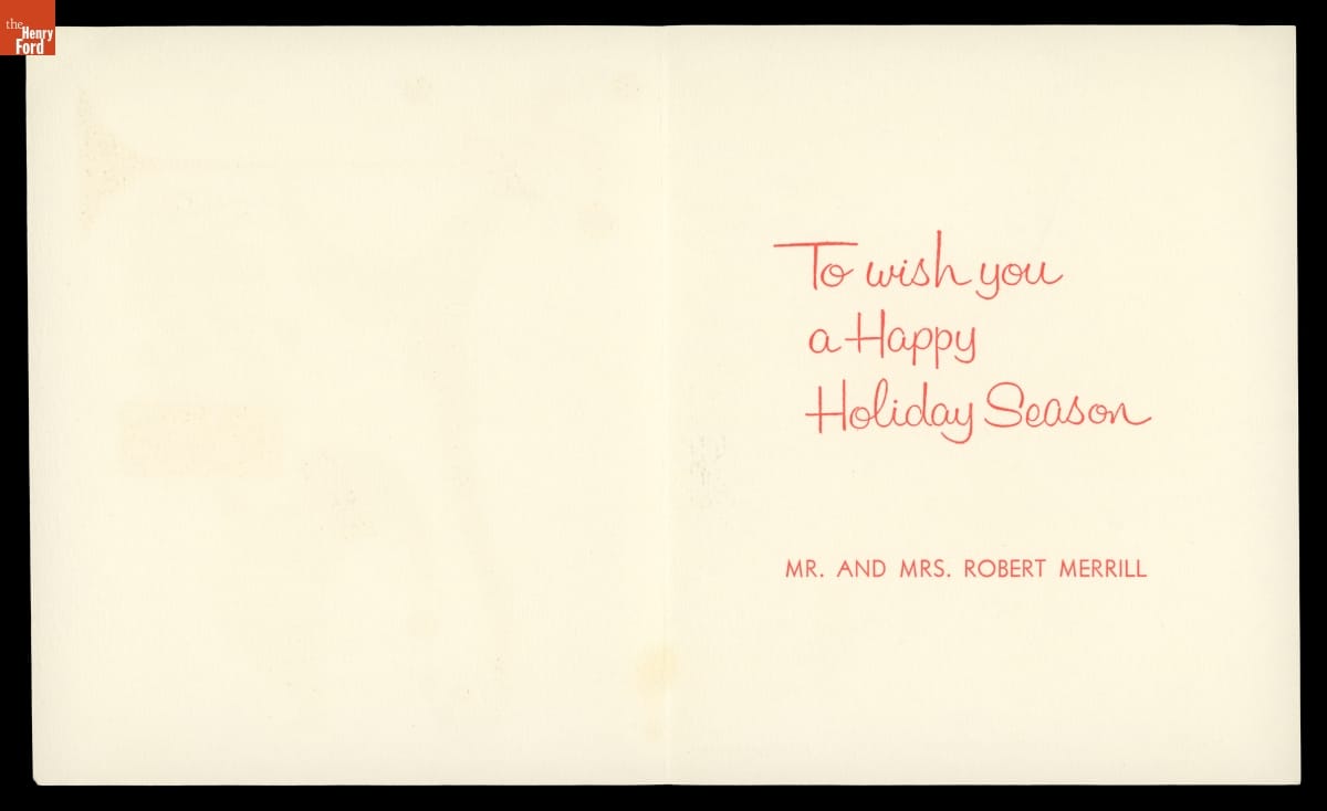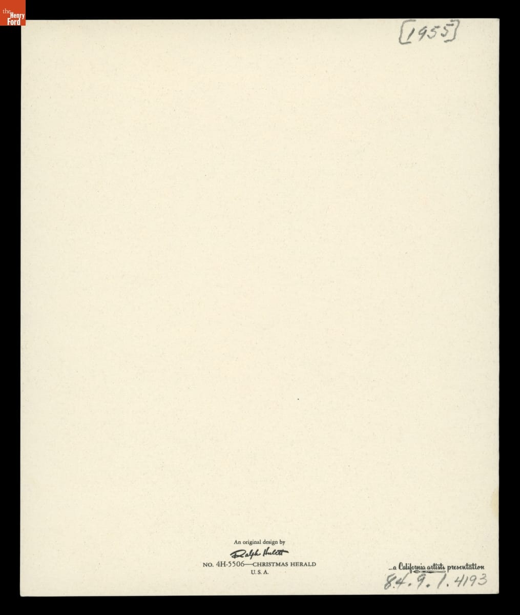 Artist Ralph Hulett (1915-1974) attended Chouinard Art Institute in Los Angeles. In 1937, while still in school, the young artist was hired by Walt Disney. Hulett would work for Disney for the rest of his career while continuing to exhibit his artwork in museums and galleries. Hulett also created commercial illustrations for various publications, including Ford Times, and in 1949 he began designing Christmas cards.