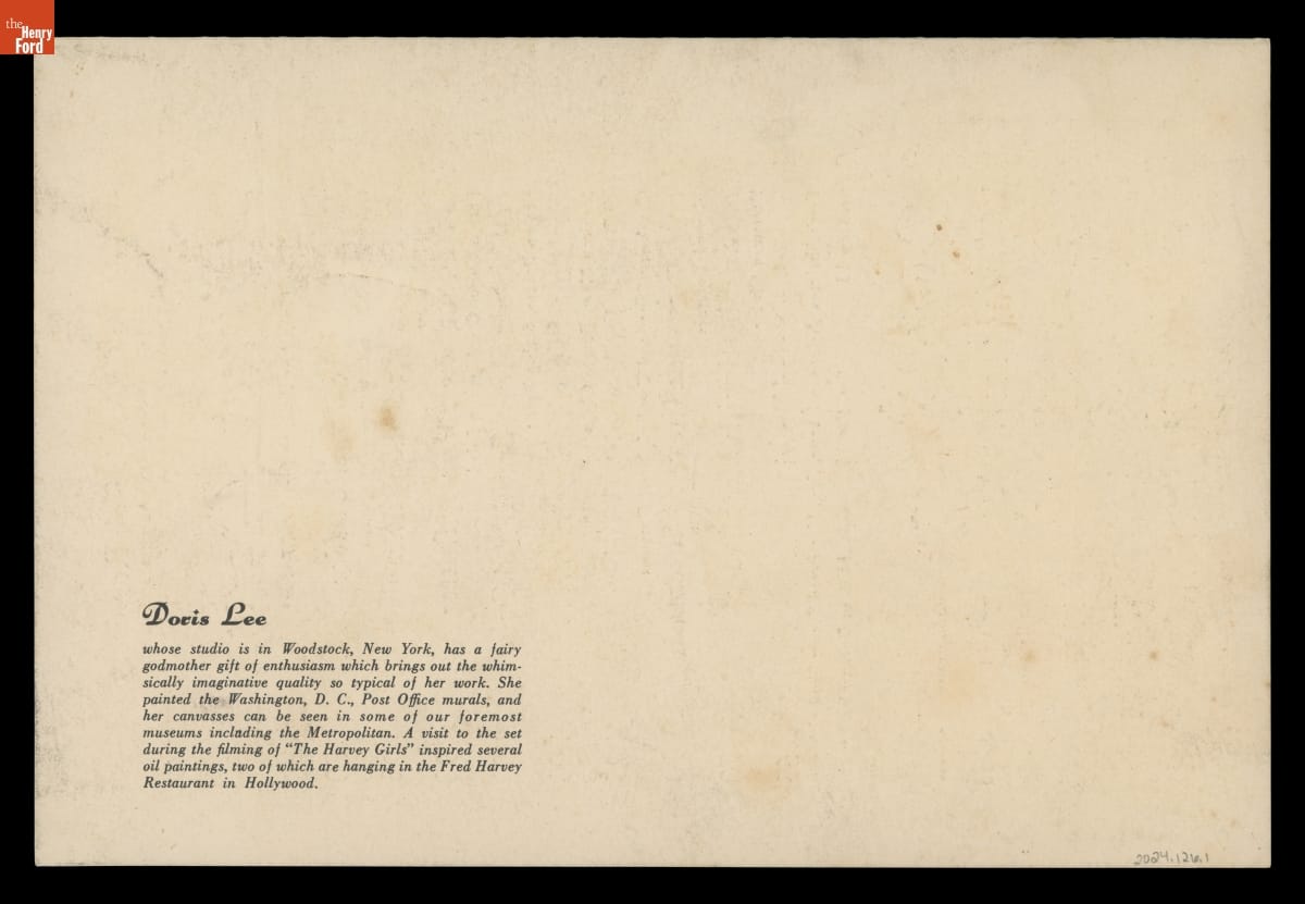 Doris Lee (1904-1983) painted scenes from everyday American life. Her interest in and collections of American folk art influenced her work. During the 1940s and 1950s, Life magazine sent Lee on several assignments and commissioned her to illustrate her travels. In 1945, she went to Hollywood. While there, MGM, too, hired Lee to create works around its film, The Harvey Girls.