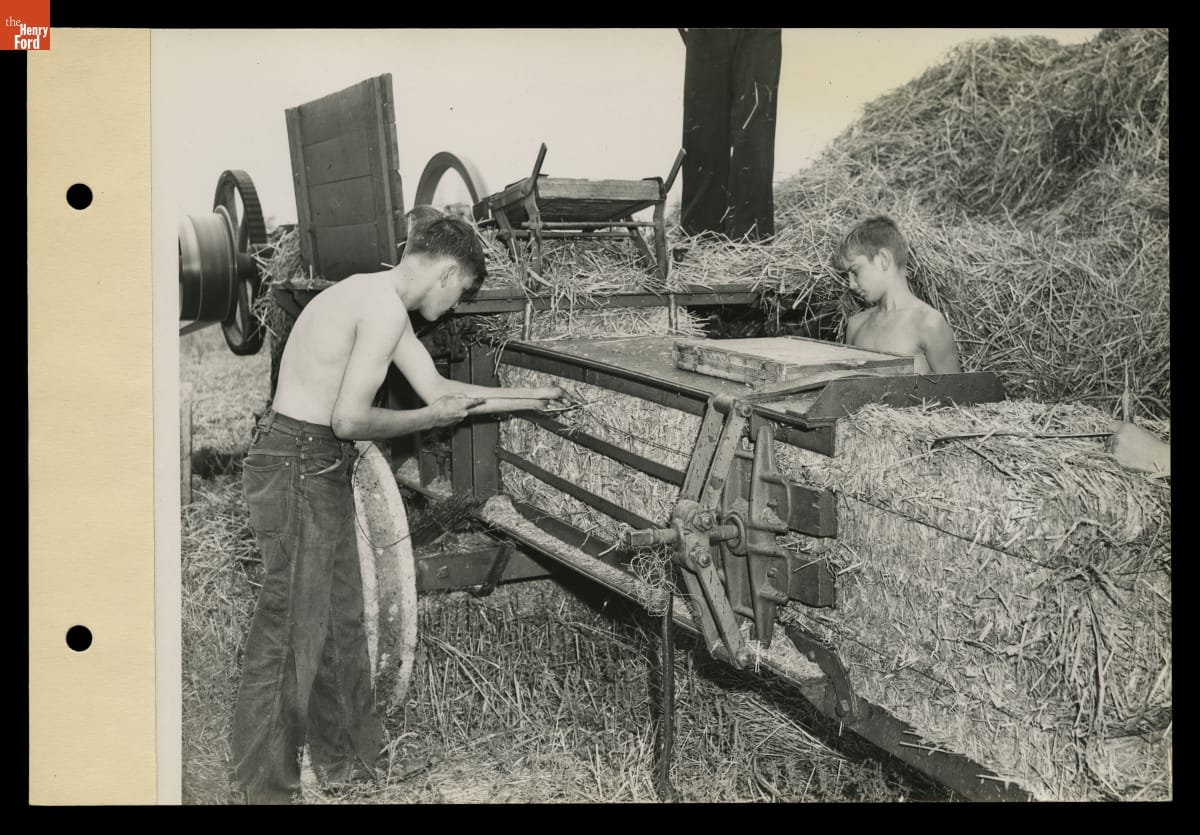 Macon (Michigan) High School Students Working on a Farm, Baling Straw after Threshing and Typing Bales, August 1943