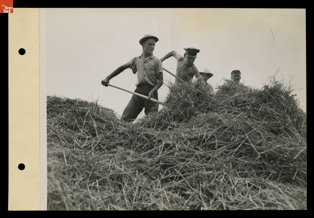 Macon (Michigan) High School Students Lynn House and Robert Bachtel Pitching Straw into a Baler, August 1943