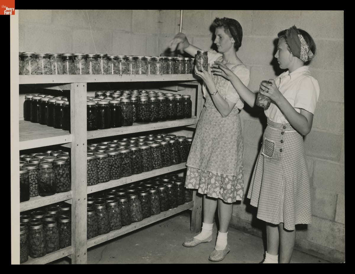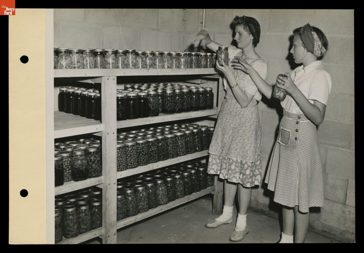 Macon (Michigan) High School Students Marjorie Korth and Joan Cadmus Organize Jars of Asparagus on Shelves, August 1943