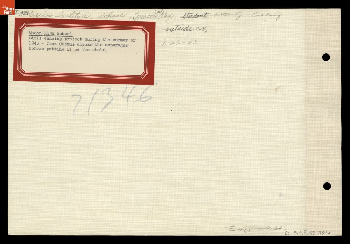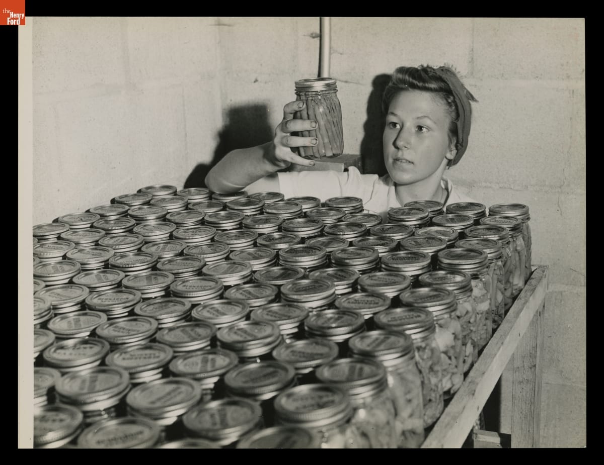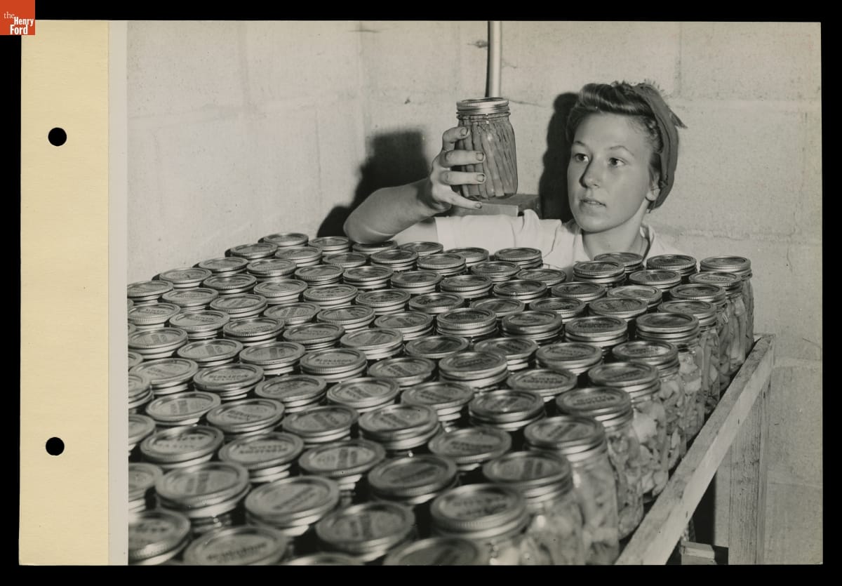 Macon (Michigan) High School Student Joan Cadmus Checks Canned Asparagus before Putting it on a Shelf, August 1943