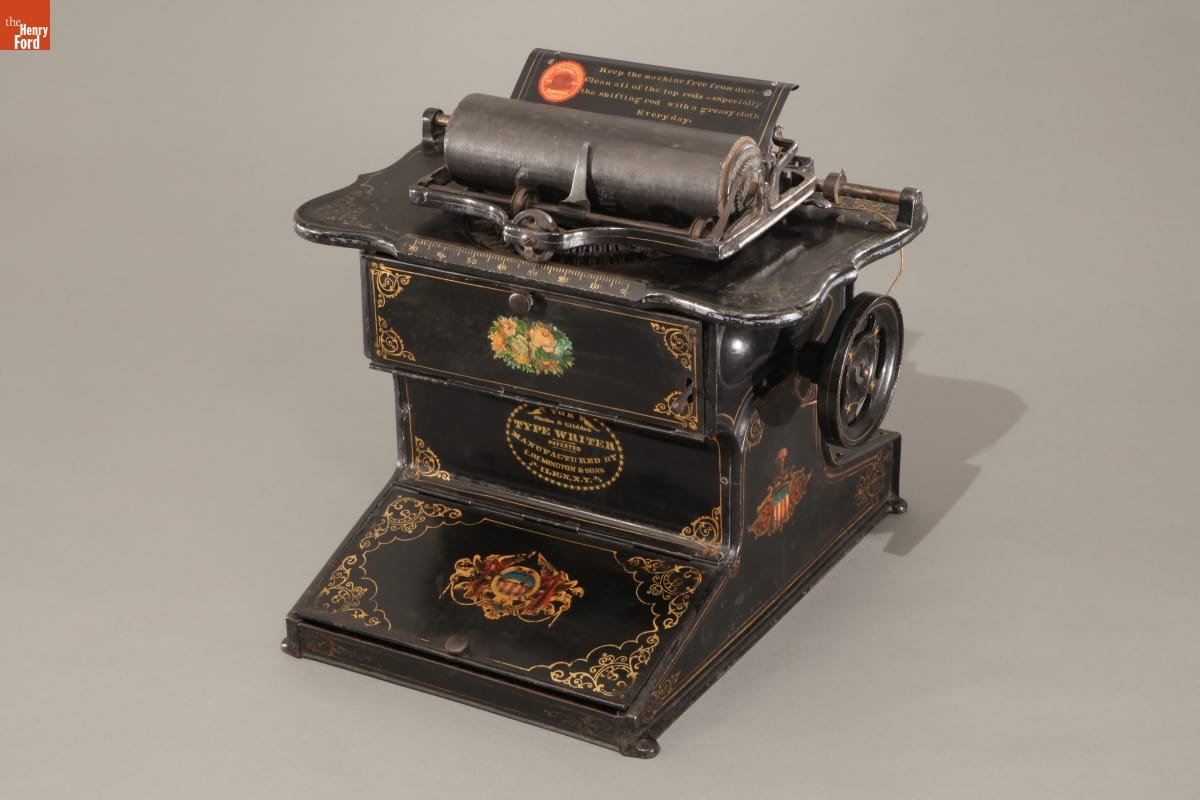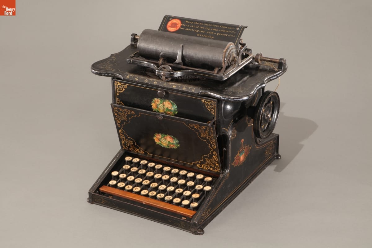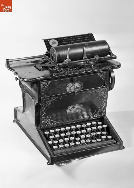 Developed by Christopher Glidden in the 1860s and manufactured by the Remington arms company beginning in 1873, the Sholes & Glidden was the first commercially successful typewriter. Its adoption by large corporations kickstarted the typewriter industry and contributed to the speedup of American work life. The innovations of the Sholes & Glidden, particularly its keyboard layout, were widely adopted. This typewriter is why your computer keyboard reads QWERTYUIOP.