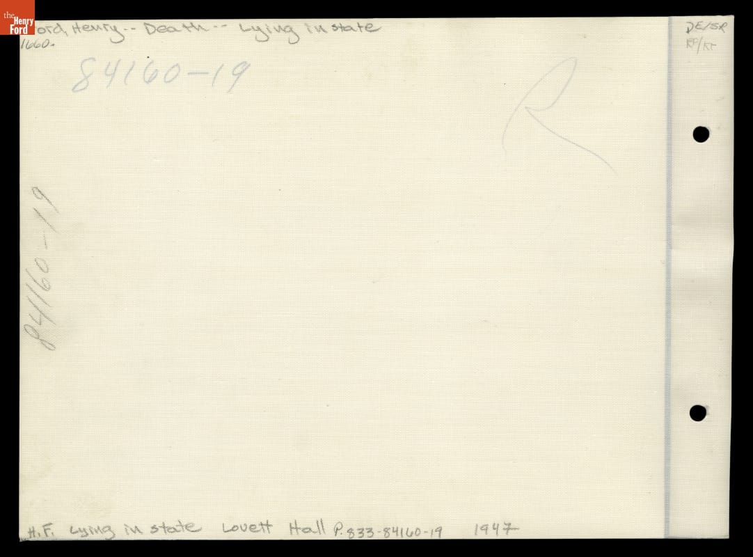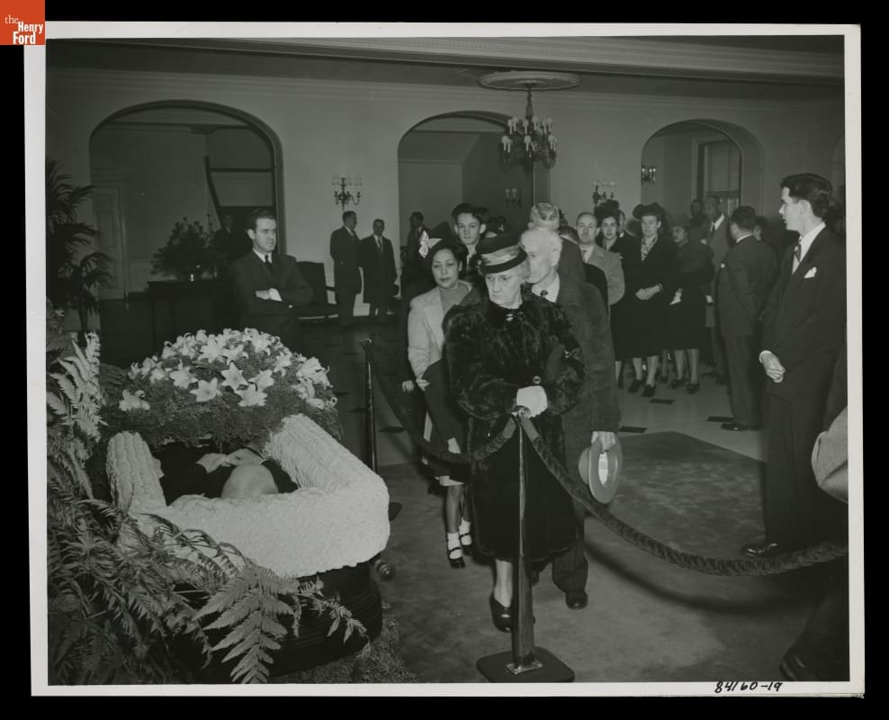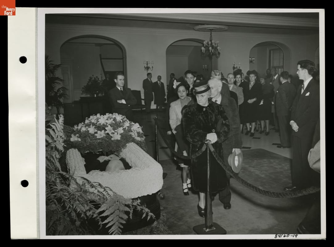 Henry Ford died on April 7, 1947, at his Fair Lane estate in Dearborn, Michigan. Thousands mourned his death. Before his funeral, Ford's body lay in repose in the lobby of what is now Lovett Hall near Greenfield Village. Many waited in a mile-long line to pay their last respects to the automotive pioneer.