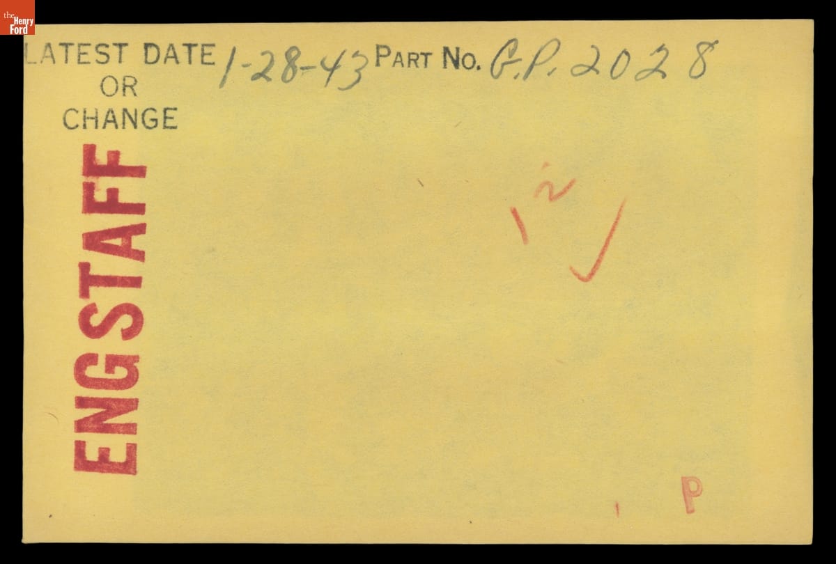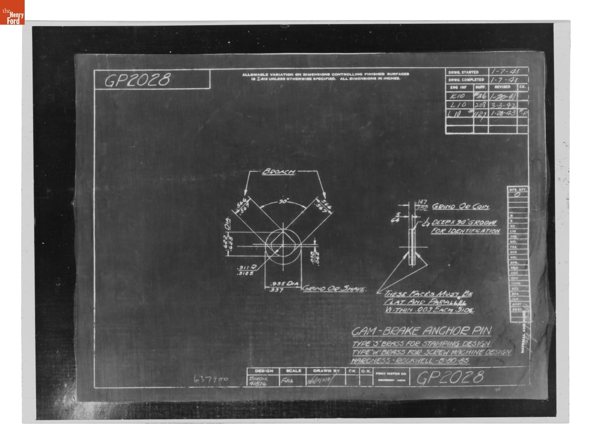The Ford Motor Company created over a million parts drawings from 1903 to 1957. Many of these drawings specify engineering requirements for the components of Ford-made vehicles--including automobiles, trucks, tractors, military vehicles and Tri-motor airplanes. Others document assembly components, stages of casting and forging, or experimental designs. Beginning in the 1940s, Ford transferred the drawings to microfilm.