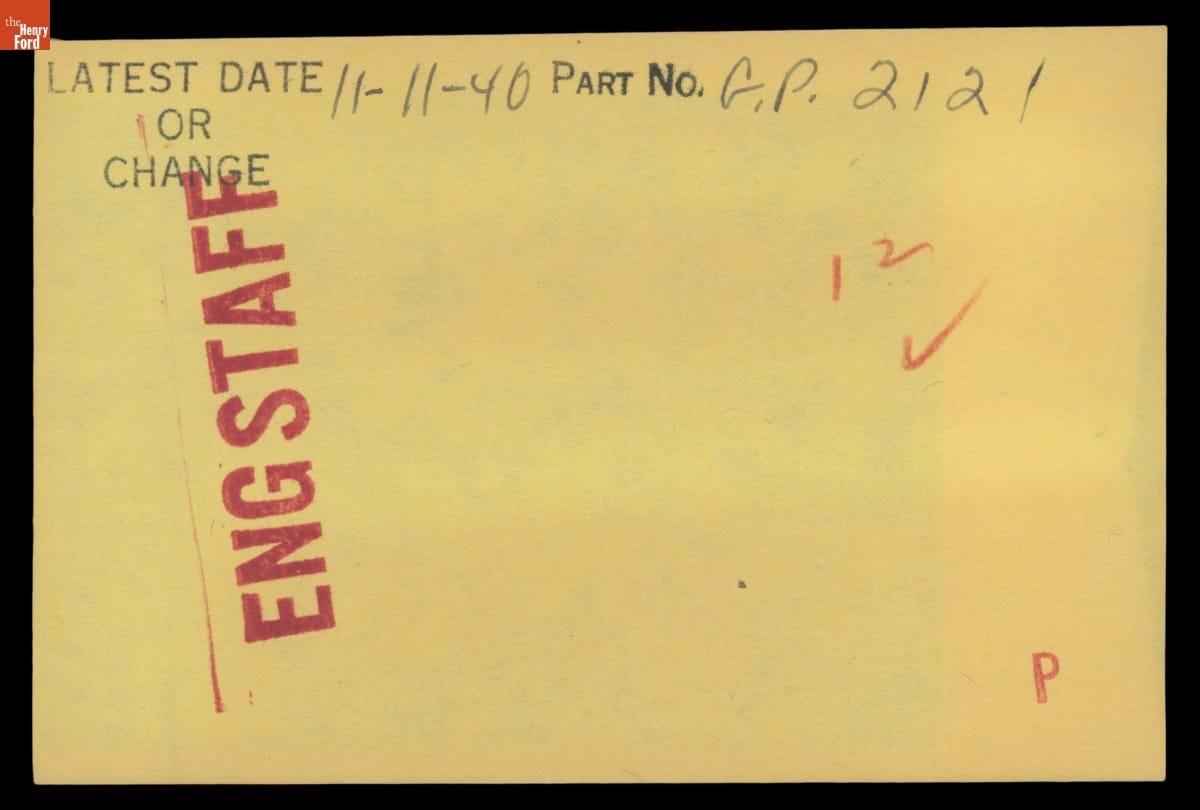 The Ford Motor Company created over a million parts drawings from 1903 to 1957. Many of these drawings specify engineering requirements for the components of Ford-made vehicles--including automobiles, trucks, tractors, military vehicles and Tri-motor airplanes. Others document assembly components, stages of casting and forging, or experimental designs. Beginning in the 1940s, Ford transferred the drawings to microfilm.