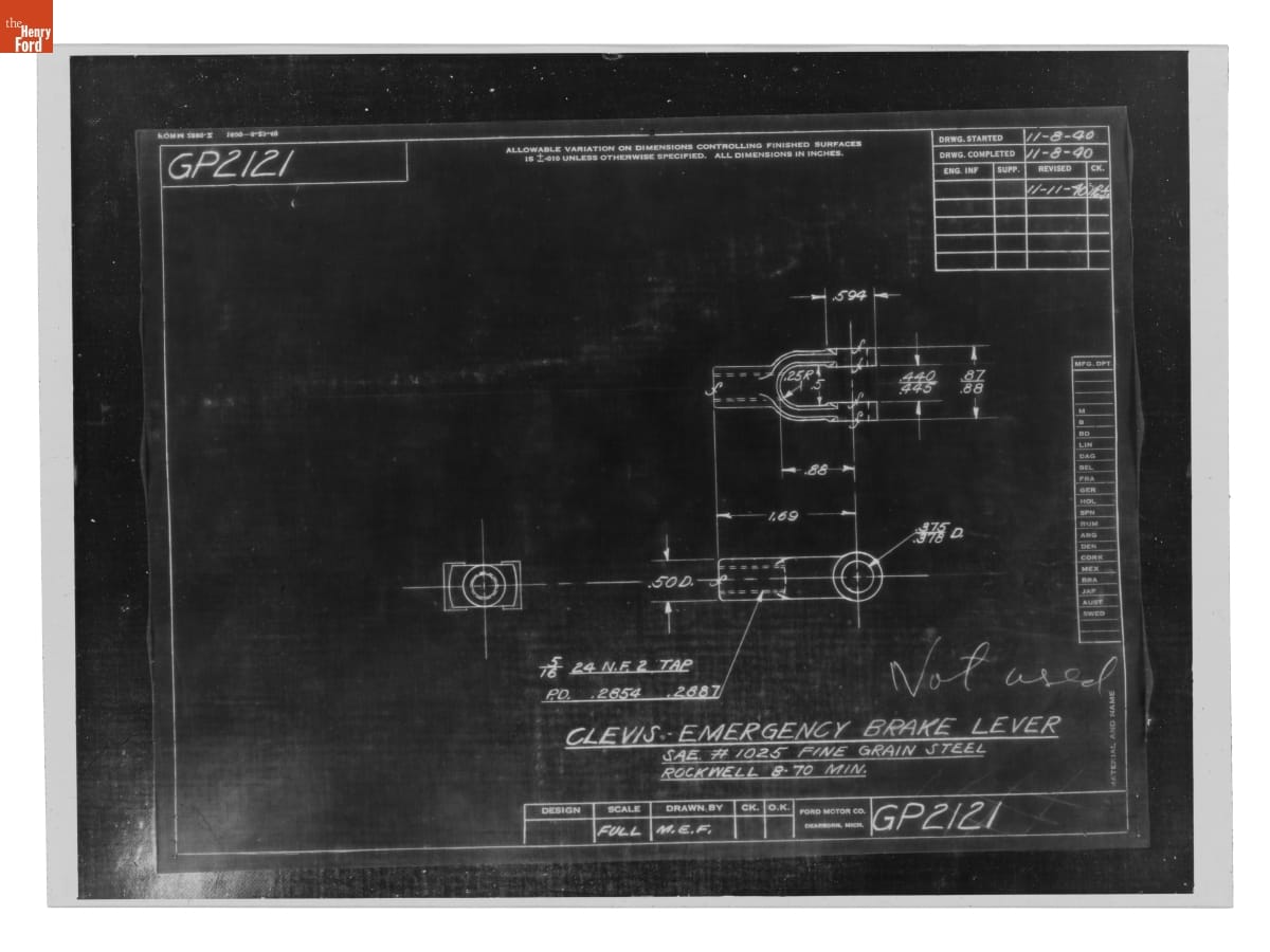 Drawing, "Clevis - Emergency Brake Lever," Ford GP, November 11, 1940