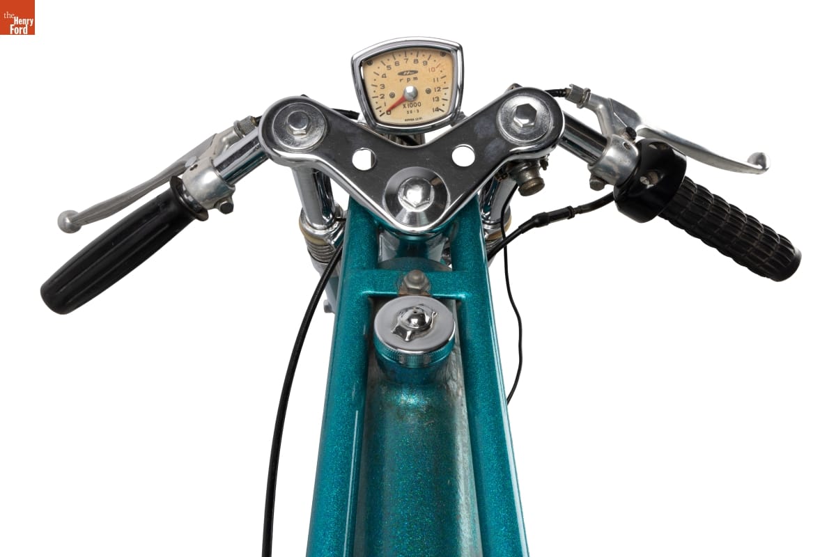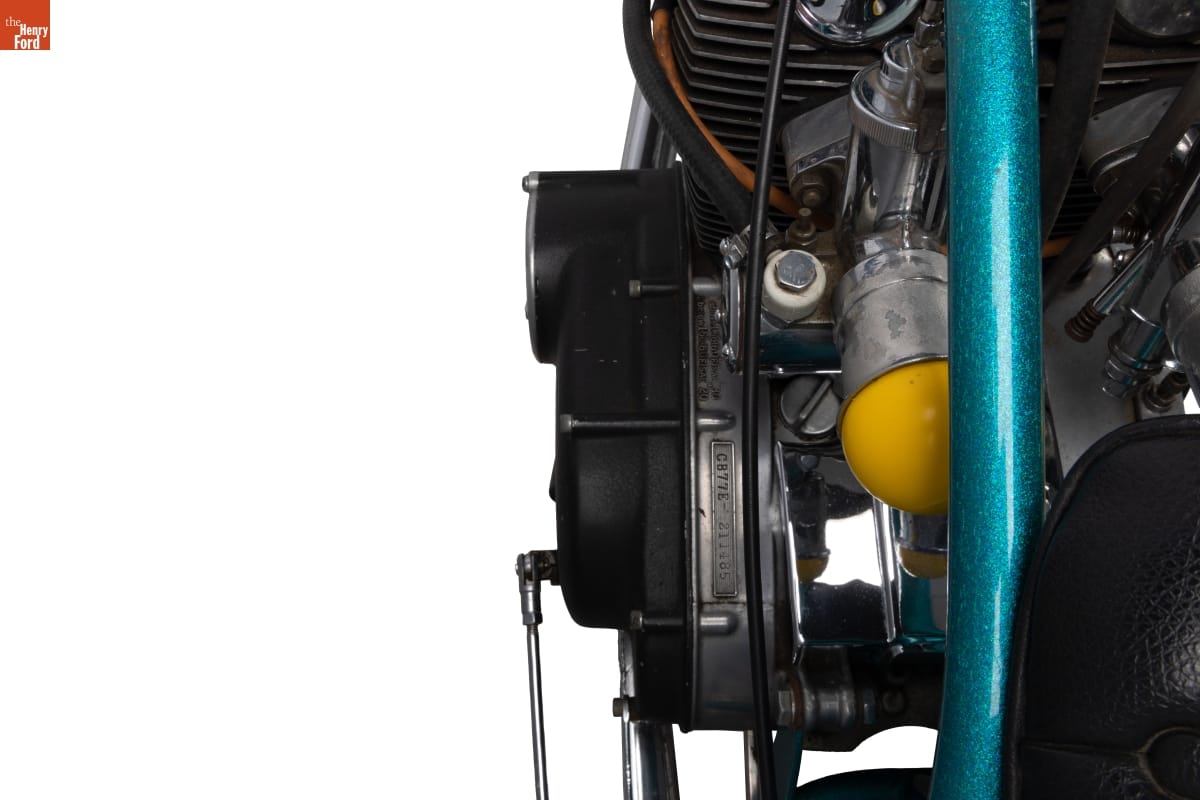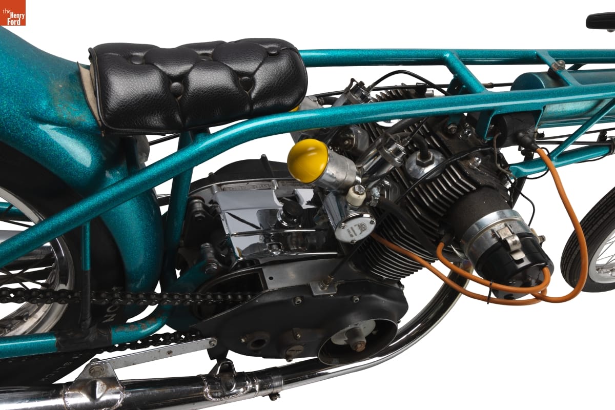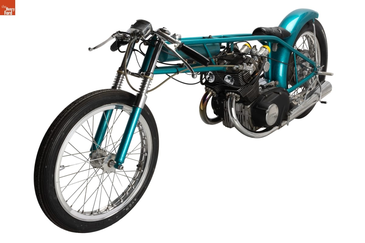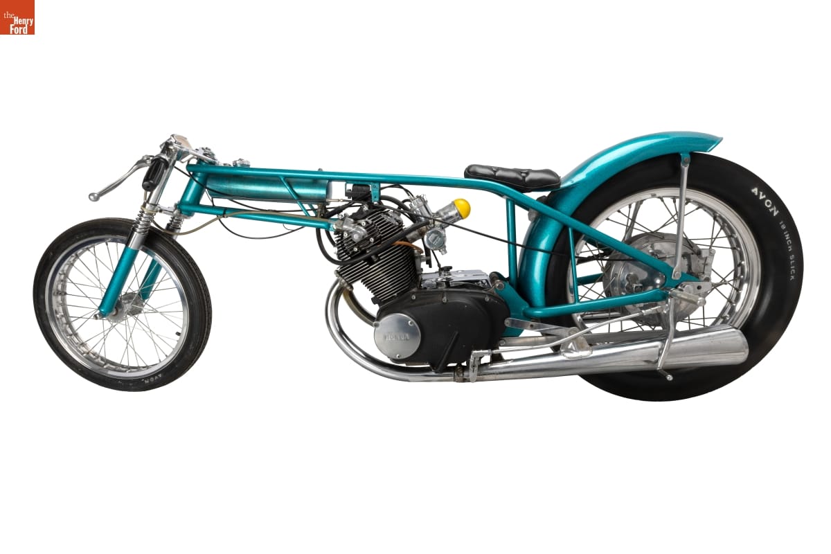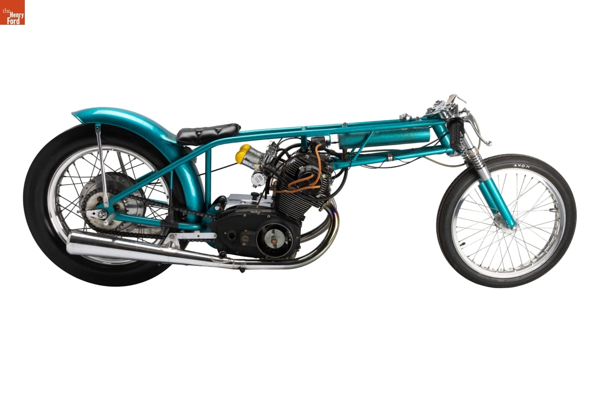 Amateur racers Barry Egen and Wayne Snyder of Monroe, Michigan, competed with this custom-built motorcycle at nearby Milan Dragway in the late 1960s. They named it "Revolution" after a popular Beatles song. Powered by a 350-cubic-centimeter, straight-twin Honda engine, the bike posted race times in the low 12-second range. Egen and Snyder also exhibited "Revolution" in car and motorcycle shows.