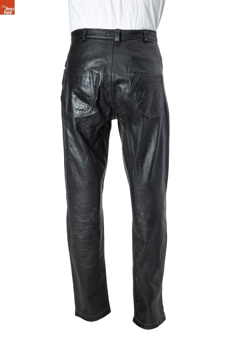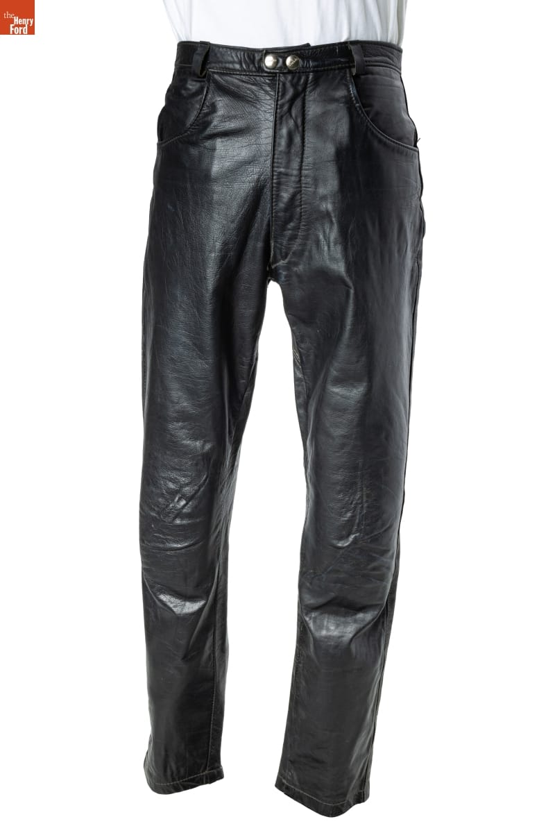 Amateur racers Barry Egen and Wayne Snyder of Monroe, Michigan, competed with their custom-built motorcycle at nearby Milan Dragway in the late 1960s. The bike, named "Revolution," was powered by a 350-cubic-centimeter, straight-twin Honda engine and posted race times in the low 12-second range. Egen wore this protective pair of leather pants when racing.