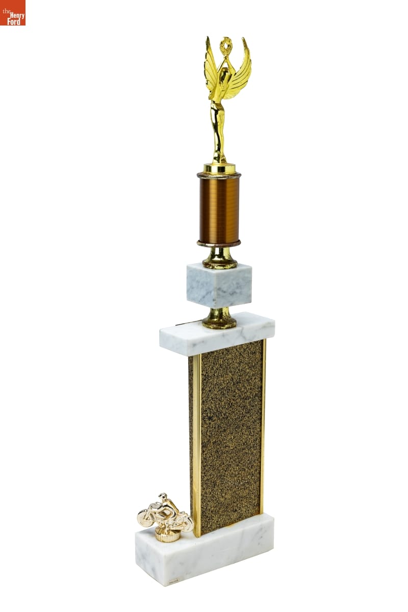 Amateur racers Barry Egen and Wayne Snyder of Monroe, Michigan, competed with their custom-built motorcycle at Milan Dragway in the late 1960s. The bike, named "Revolution," was powered by a 350-cubic-centimeter, straight-twin Honda engine and posted race times in the low 12-second range. Egen and Snyder won several trophies at Milan, including an impressive Competition Eliminator title in fall 1968.