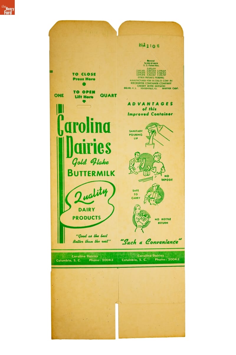 H11108 / Covered / by one or more / U. S. Patent Nos. / 2,025,477 / [...] / 2,329,797 / OTHER PATENTS PENDING / MANUFACTURED FOR EX-CELL-O CORP. BY / KIECKHEFER CONTAINER COMPANY / CHERRY RIVER DIVISION / DELAIR, N. J. BENSENVILLE, ILL. WHITTIER CALIF. / ADVANTAGES / of this / Improved Container / SANITARY / POURING / LIP / NO / DEPOSIT / SAFE / TO / CARRY / NO BOTTLE / RETURN / "Such a Convenience" / Carolina Dairies / Columbia, S. C. Phone: 20043