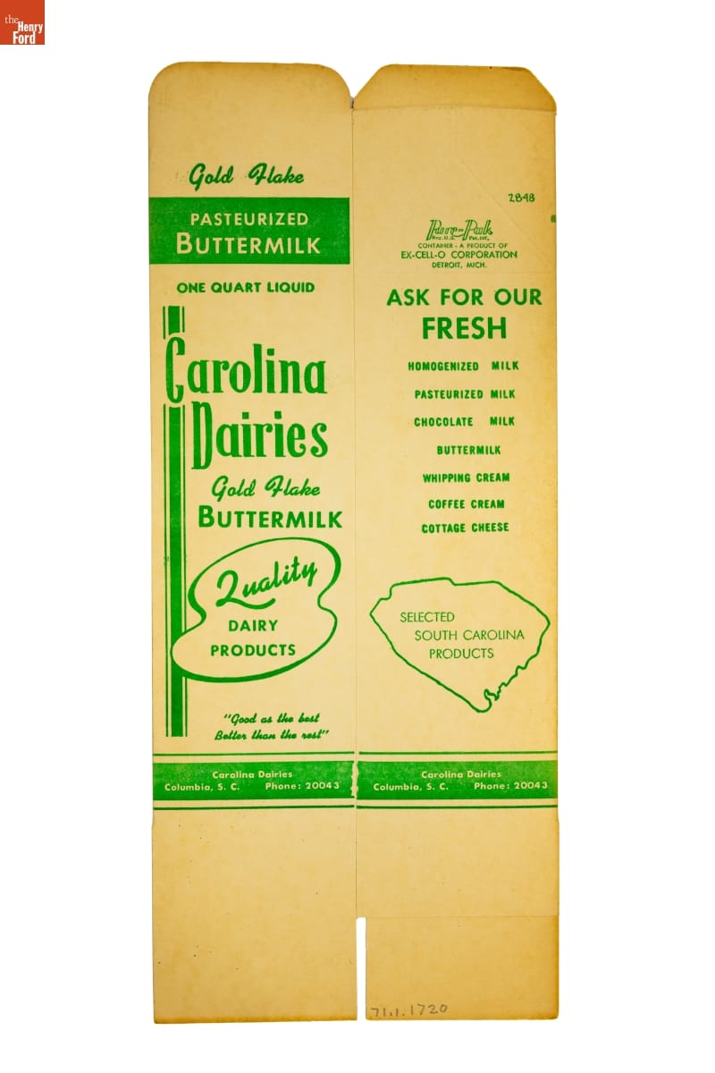 Manufactured for Ex-Cell-O Corporation, Detroit, Michigan, by the Kieckhefer Container Company, Cherry River Division, Delair, New Jersey, Bensenville, Illinois, and Whittier, California, for Carolina Dairies, Columbia, South Carolina.