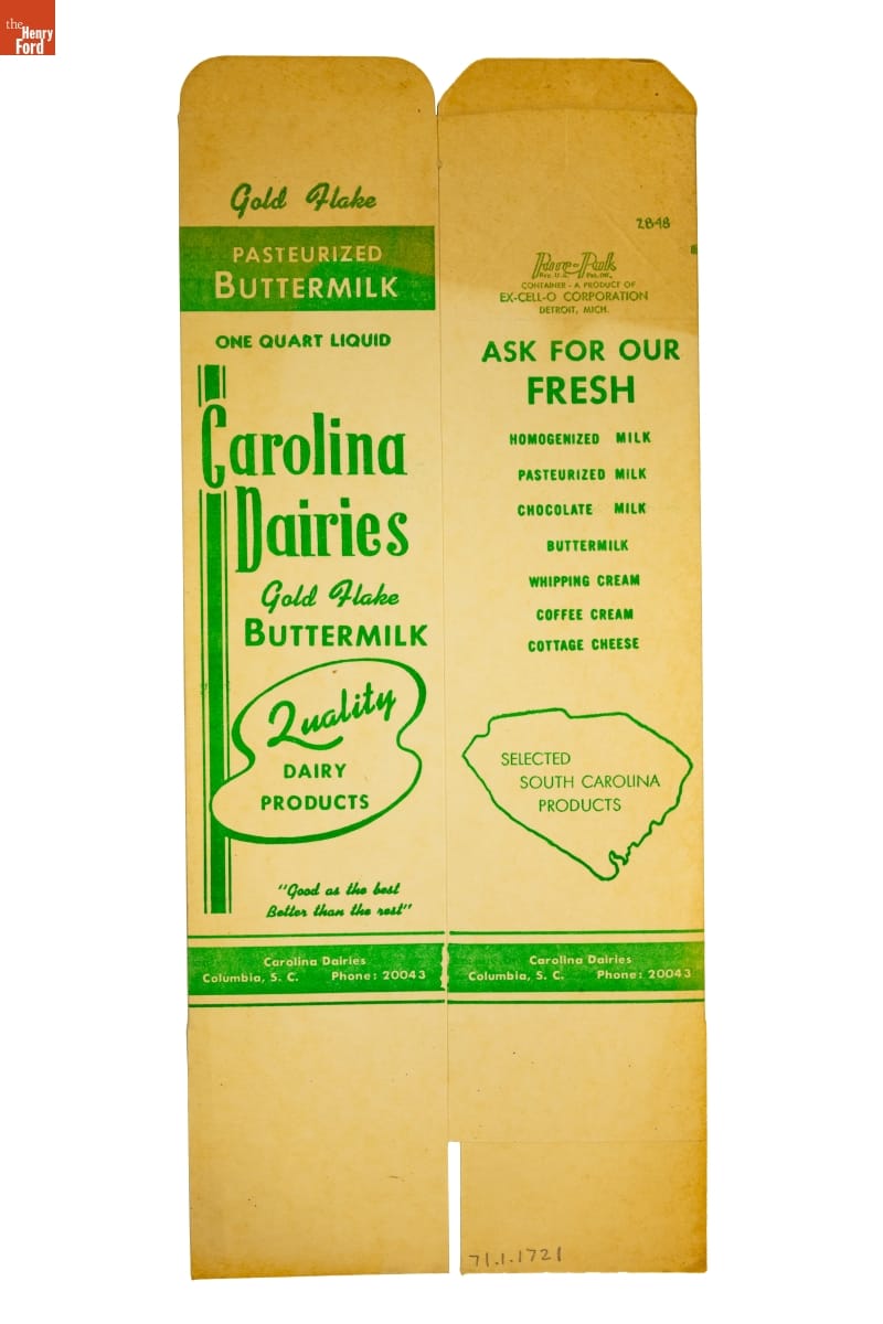 Manufactured for Ex-Cell-O Corporation, Detroit, Michigan, by the Kieckhefer Container Company, Cherry River Division, Delair, New Jersey, Bensenville, Illinois, and Whittier, California, for Carolina Dairies, Columbia, South Carolina.