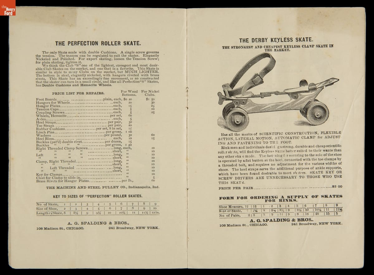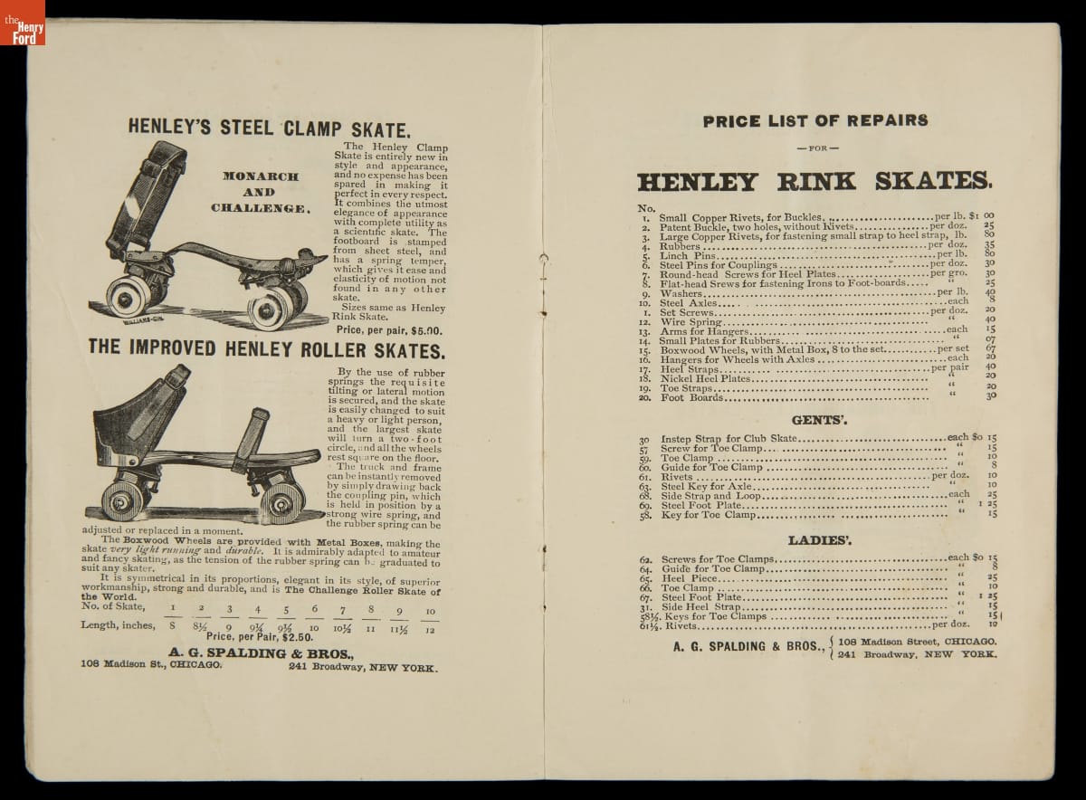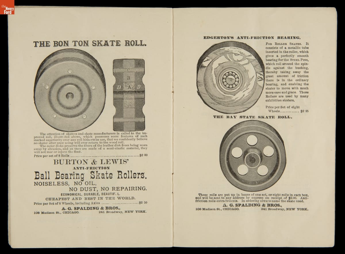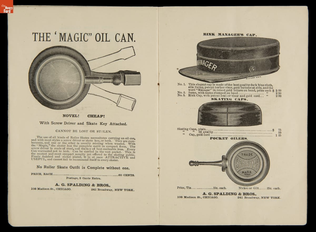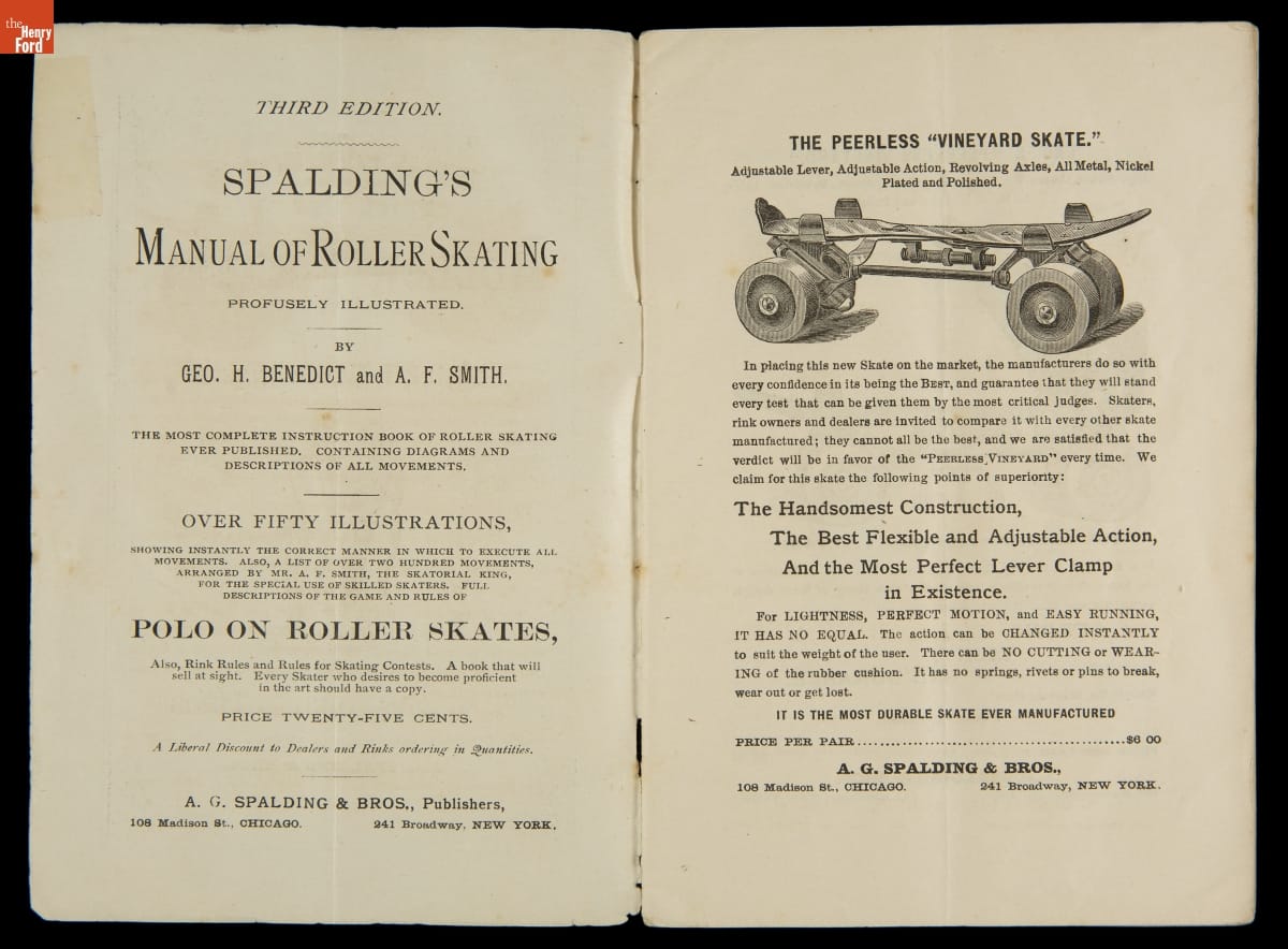 Albert Goodwill Spalding and his younger brother James formed A. G. Spalding & Brothers, a sporting goods company, in 1876. The company would become a leader in the industry in the late 1800s, producing equipment for baseball, basketball, football, golf, and all sorts of sporting activities. This catalog for roller skating goods included rules for playing polo (hockey) on skates.