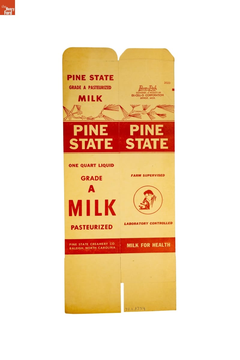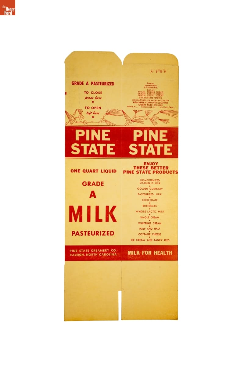 Manufactured for Ex-Cell-O Corporation, Detroit, Michigan, by the Kieckhefer Container Company, Cherry River Division, Delair, New Jersey, Bensenville, Illinois, and Whittier, California, for Pine State Creamery Co., Raleigh, North Carolina.