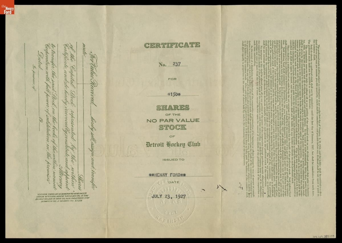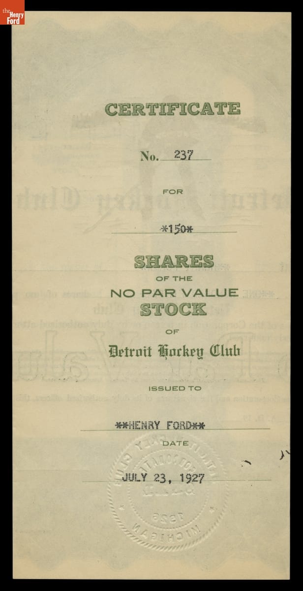Detroit Hockey Club No Par Value Stock Certificate Issued to Henry Ford, July 23, 1927