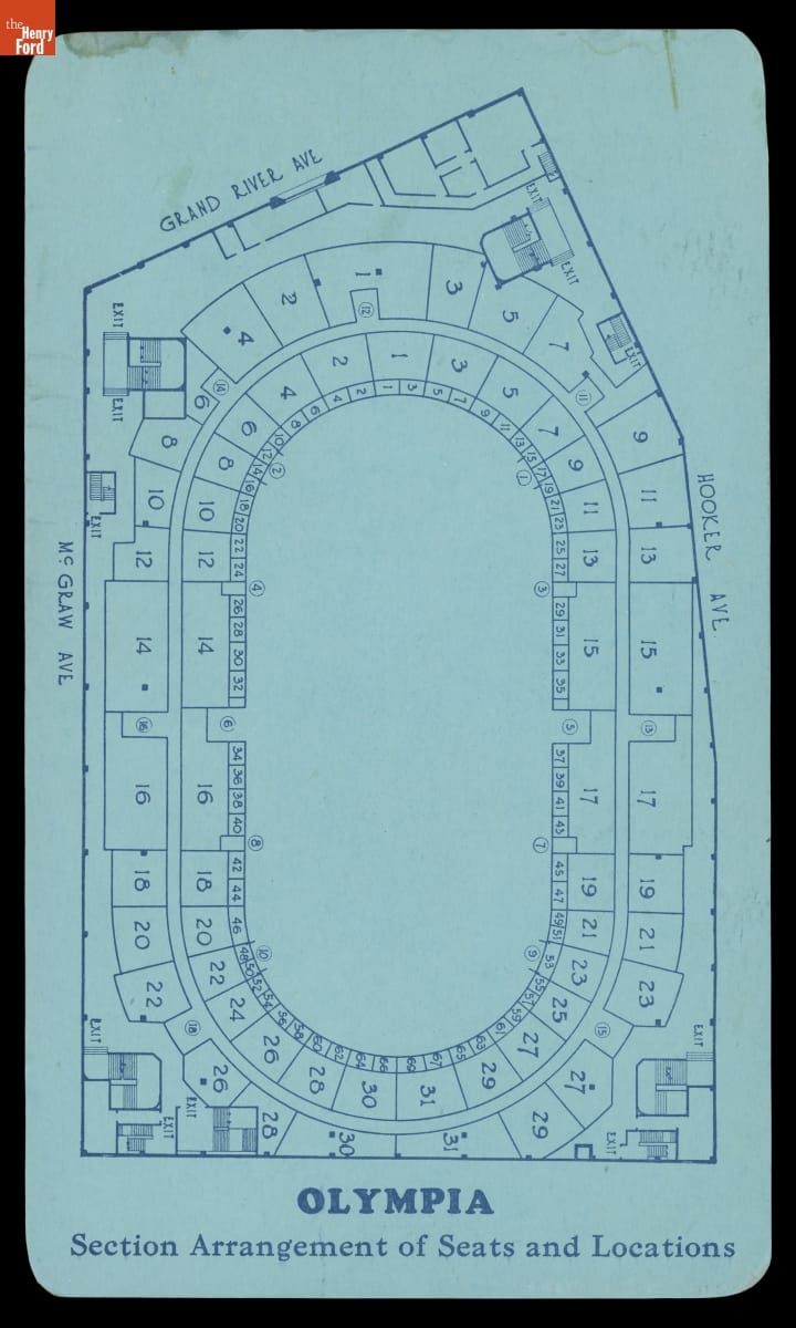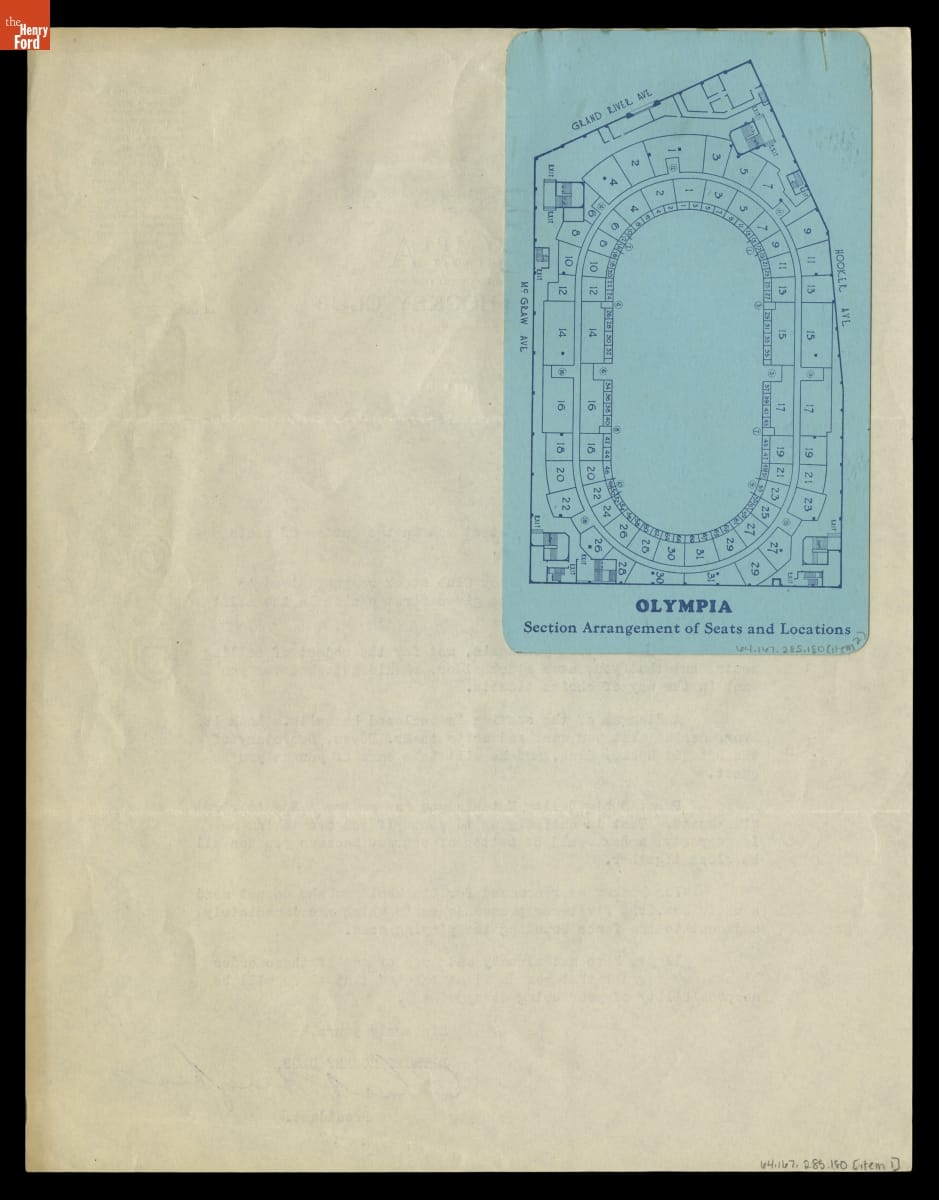 Henry Ford purchased stock in the new Detroit ice hockey team in 1927. One of the perks for shareholders was the choice of allotted seats for events at Olympia Stadium -- the newly built arena where the National Hockey League team played. The Detroit Hockey Club's president, Charles Hughes, sent this letter and a stadium seating diagram with the team's schedule to Ford.