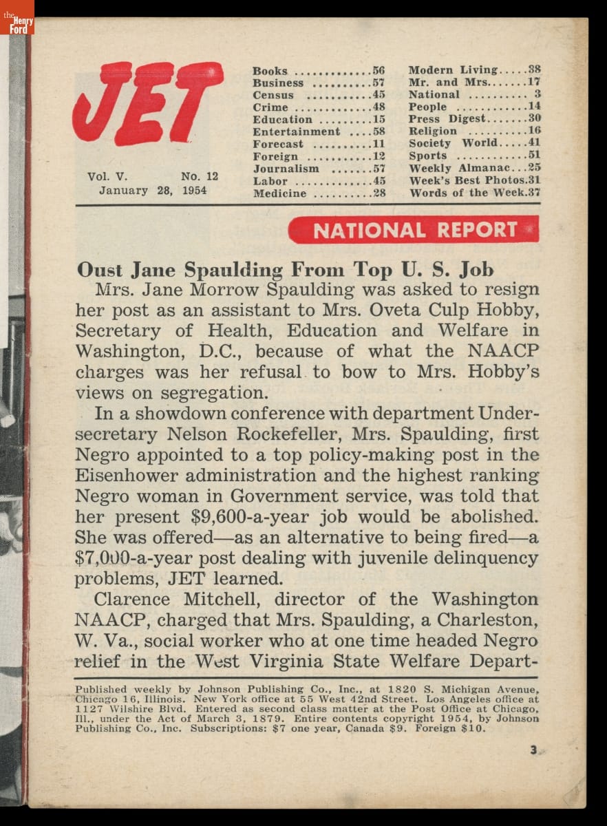John H. Johnson, head of the Chicago-based Johnson Publishing Company, founded Jet magazine in November 1951. Originally billed as "The Weekly Negro News Magazine," the publication printed news, culture, and entertainment articles related to the African American community. Jet also chronicled the civil rights movement from its earliest years, addressing racial violence and inequality in American society.