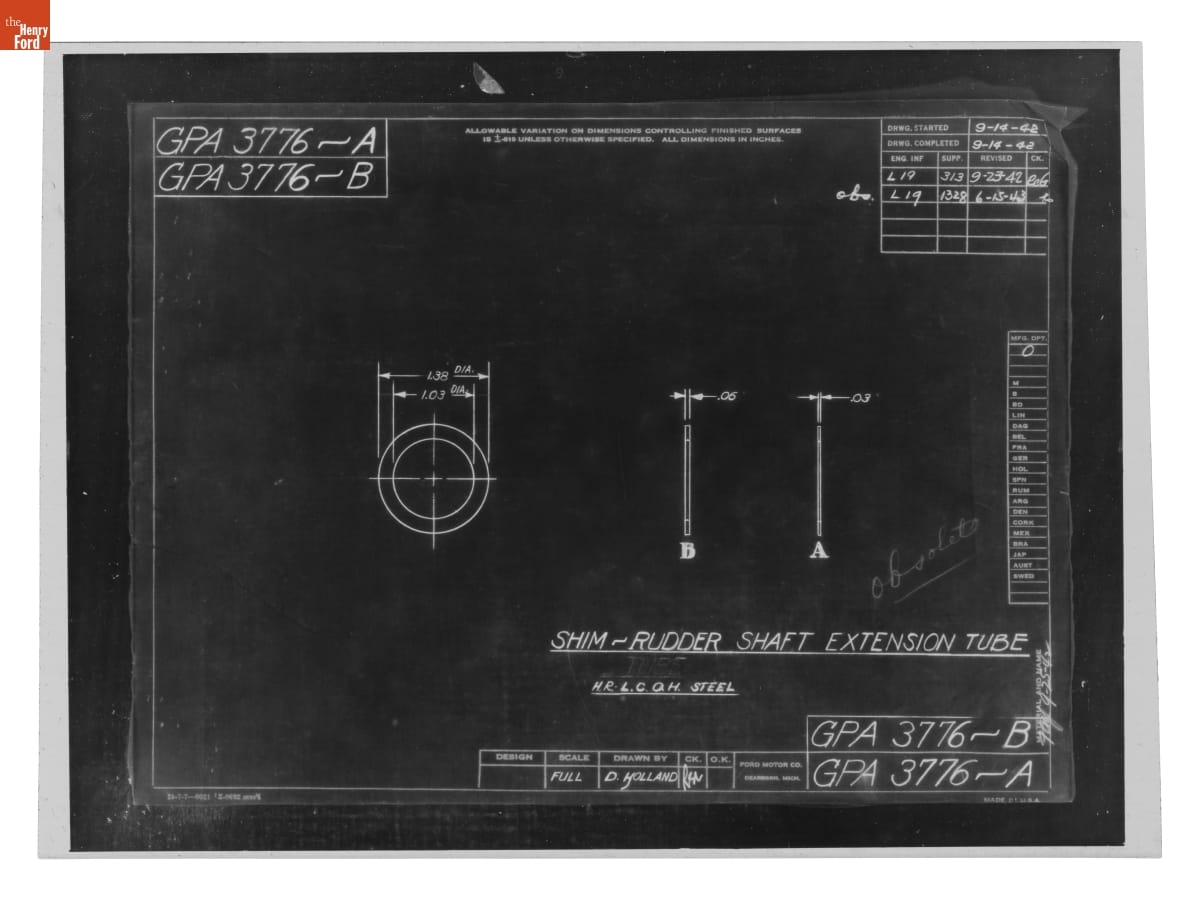 Drawing, "Shim - Rudder Shaft Extension Tube," Ford GPA, June 15, 1943