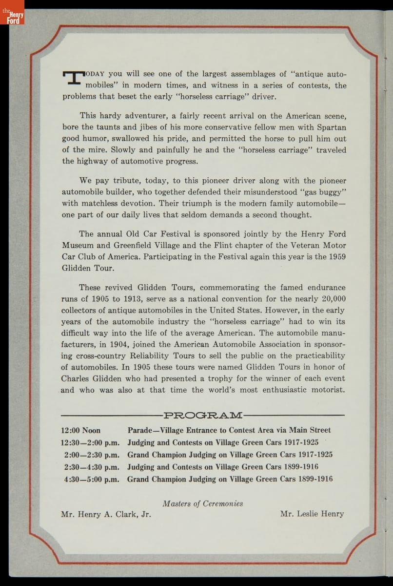 Held annually since 1951, The Henry Ford's Old Car Festival is the longest-running antique automobile show in the United States. While its specific events, activities and featured time periods have evolved over the decades, Old Car Festival's enthusiastic celebration of early American motoring remains unchanged.
