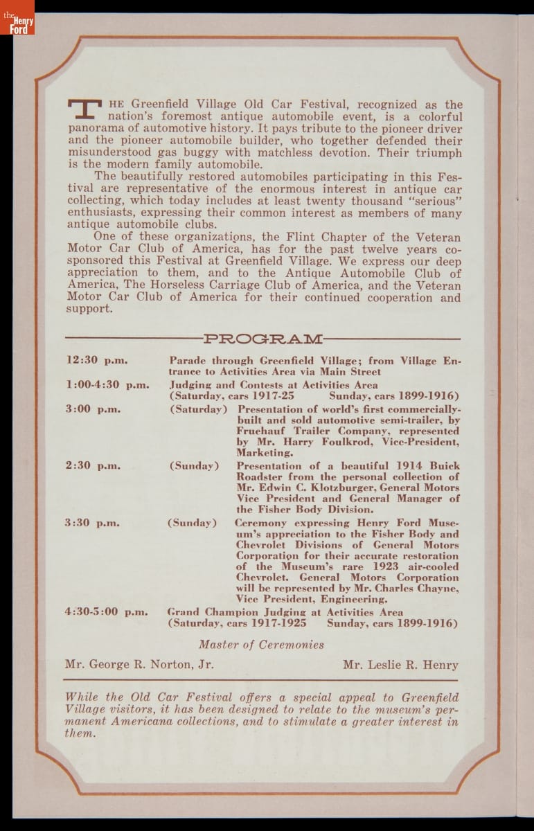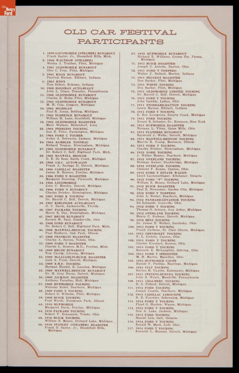 Held annually since 1951, The Henry Ford's Old Car Festival is the longest-running antique automobile show in the United States. While its specific events, activities and featured time periods have evolved over the decades, Old Car Festival's enthusiastic celebration of early American motoring remains unchanged.