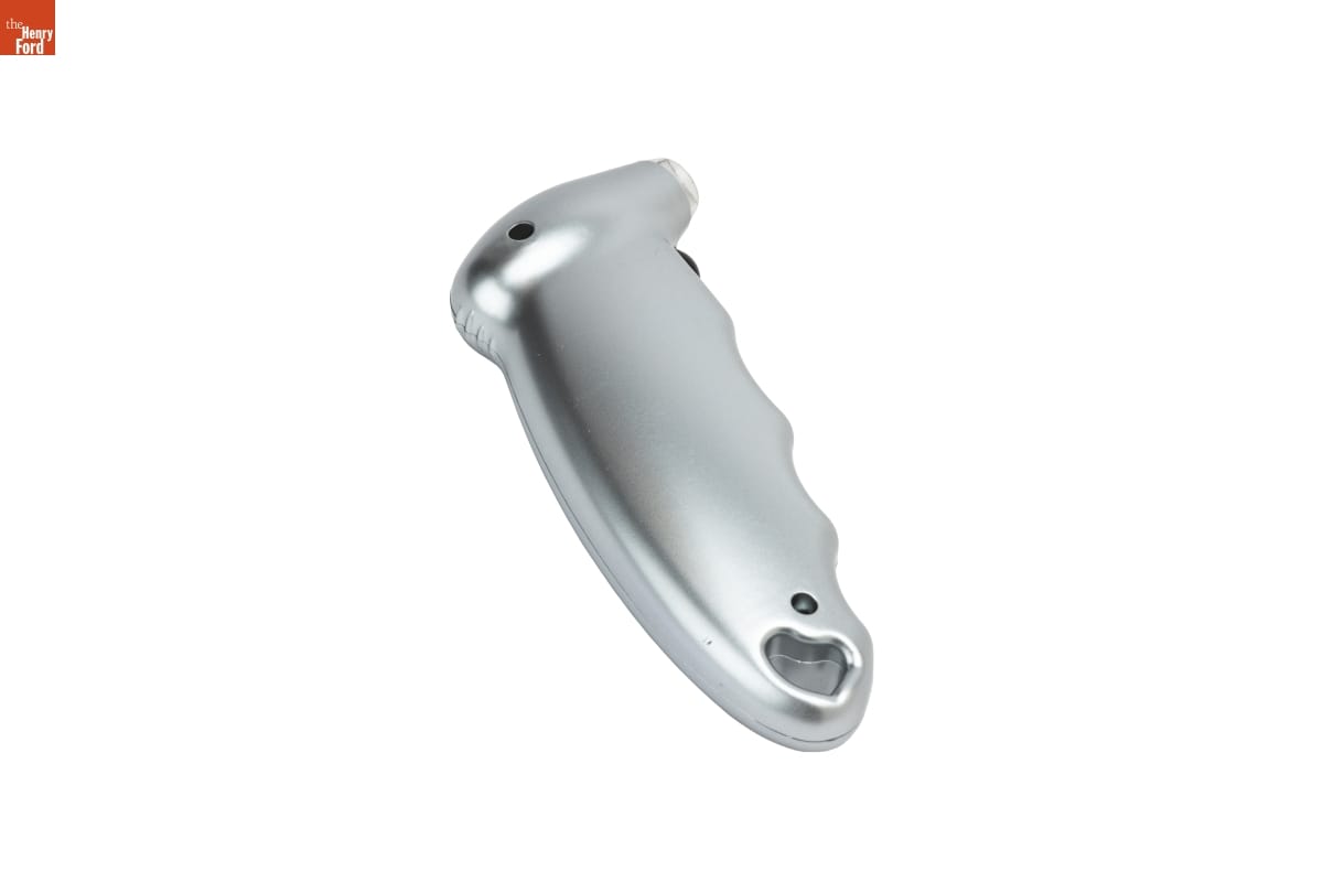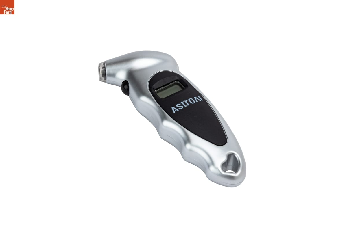 Gauges like this one measured air pressure inside a motor vehicle's tires. Its digital readout provided more precise readings than those from analog-dial units. Maintaining correct tire pressure improves vehicle safety, fuel efficiency, and tire service life. Since 2007, vehicles sold in the United States have been required to have their own internal measuring systems.
