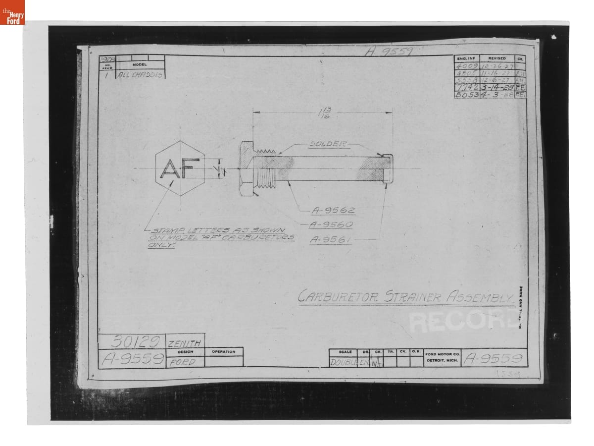 Drawing, "Carburetor Strainer Assembly," Ford Model A, April 3, 1928