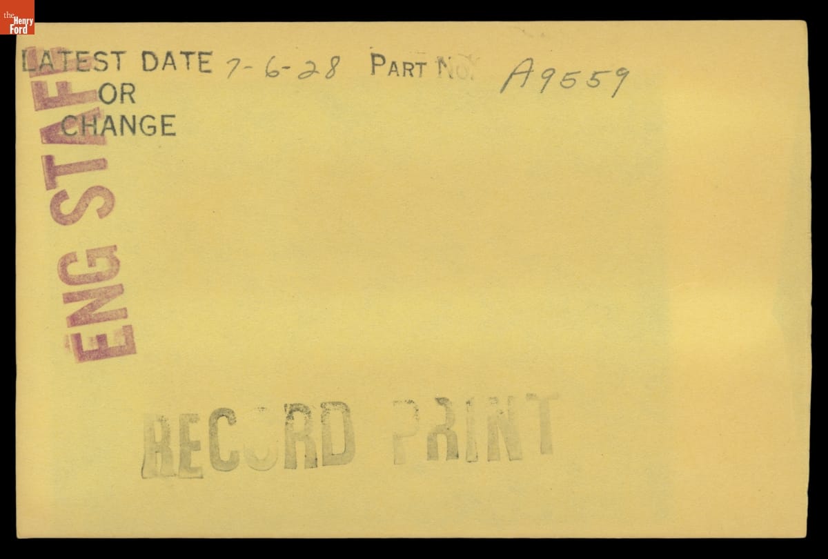 The Ford Motor Company created over a million parts drawings from 1903 to 1957. Many of these drawings specify engineering requirements for the components of Ford-made vehicles--including automobiles, trucks, tractors, military vehicles and Tri-motor airplanes. Others document assembly components, stages of casting and forging, or experimental designs. Beginning in the 1940s, Ford transferred the drawings to microfilm.