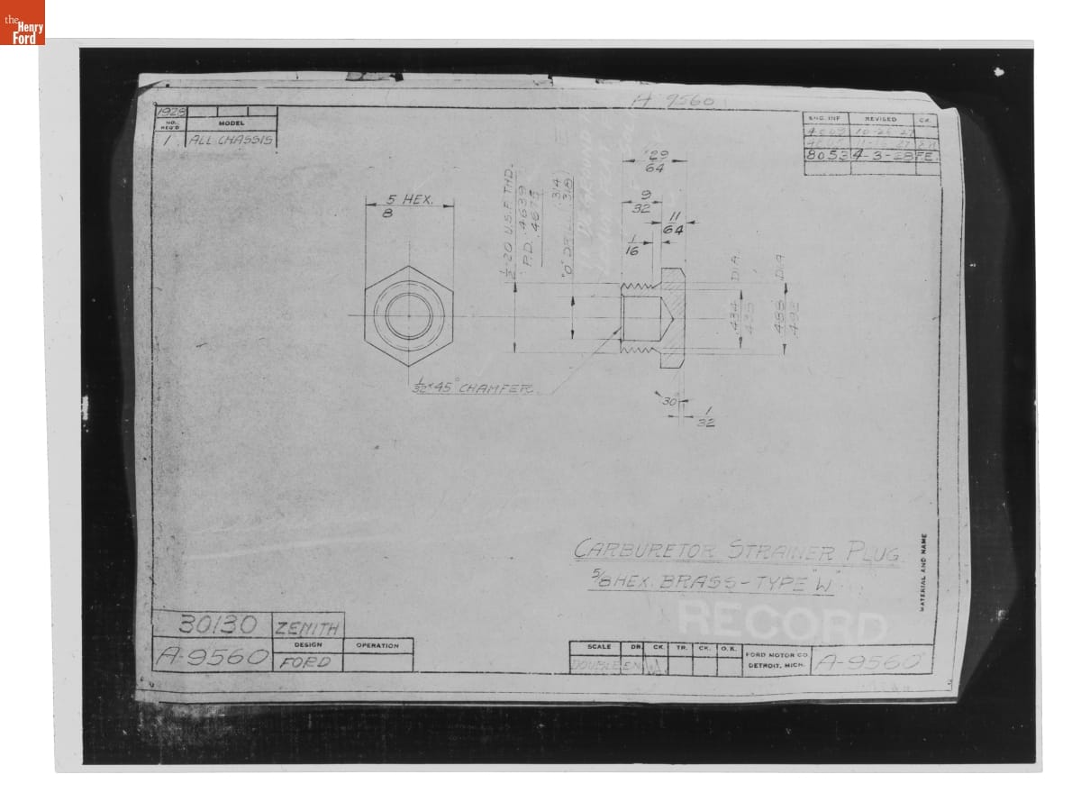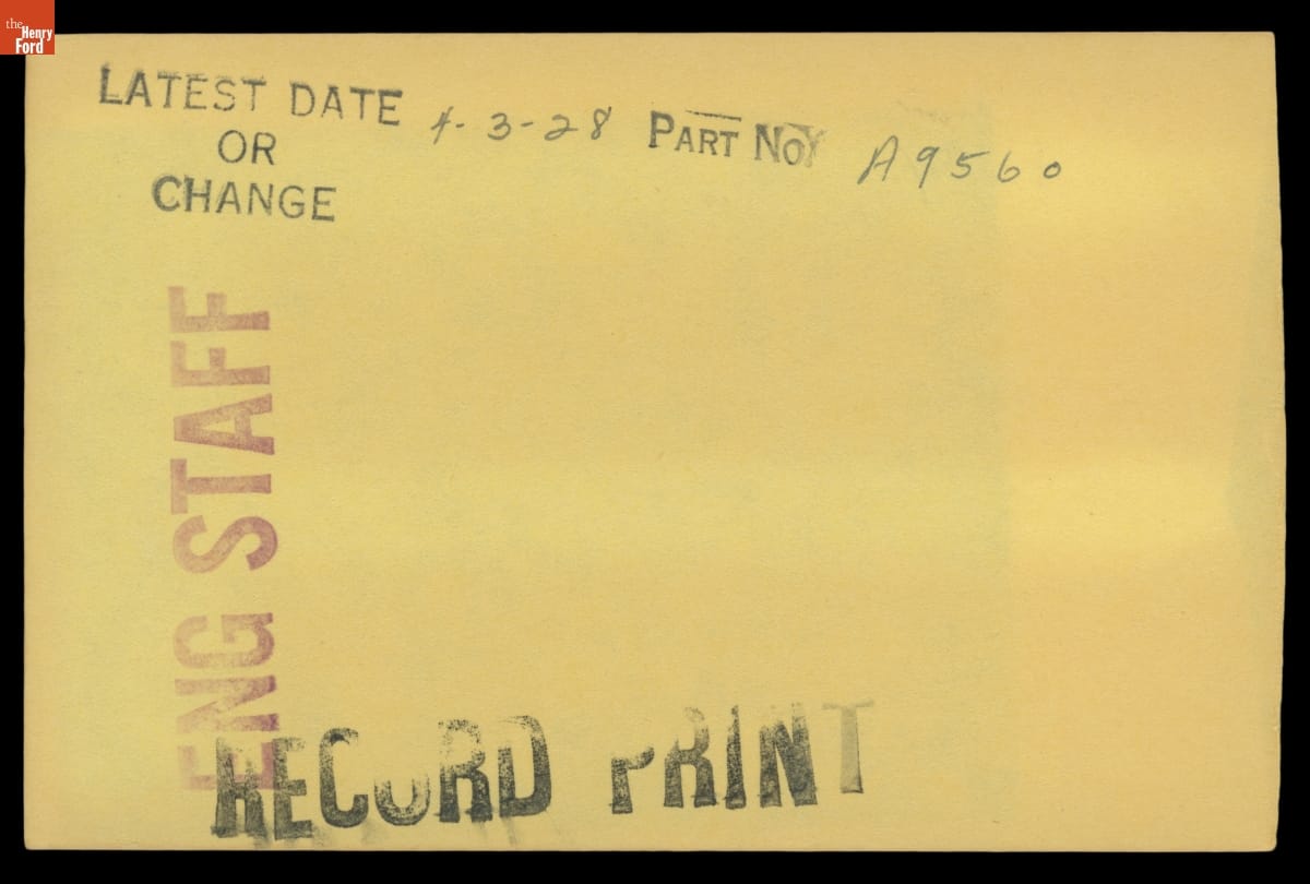 The Ford Motor Company created over a million parts drawings from 1903 to 1957. Many of these drawings specify engineering requirements for the components of Ford-made vehicles--including automobiles, trucks, tractors, military vehicles and Tri-motor airplanes. Others document assembly components, stages of casting and forging, or experimental designs. Beginning in the 1940s, Ford transferred the drawings to microfilm.