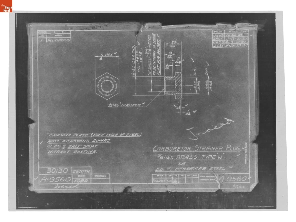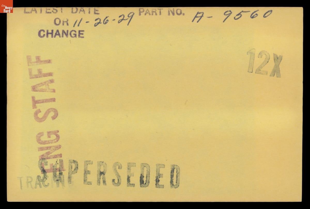 The Ford Motor Company created over a million parts drawings from 1903 to 1957. Many of these drawings specify engineering requirements for the components of Ford-made vehicles--including automobiles, trucks, tractors, military vehicles and Tri-motor airplanes. Others document assembly components, stages of casting and forging, or experimental designs. Beginning in the 1940s, Ford transferred the drawings to microfilm.