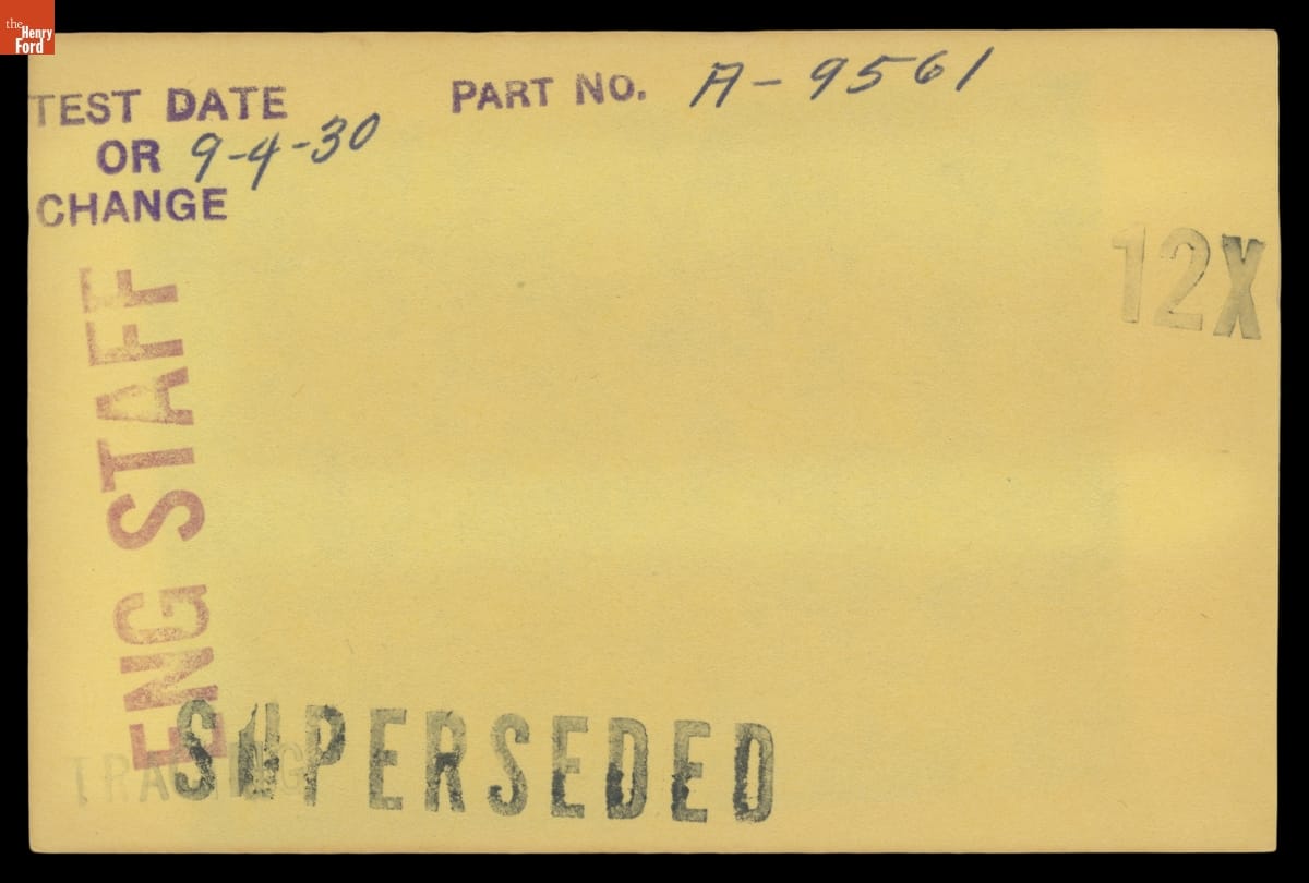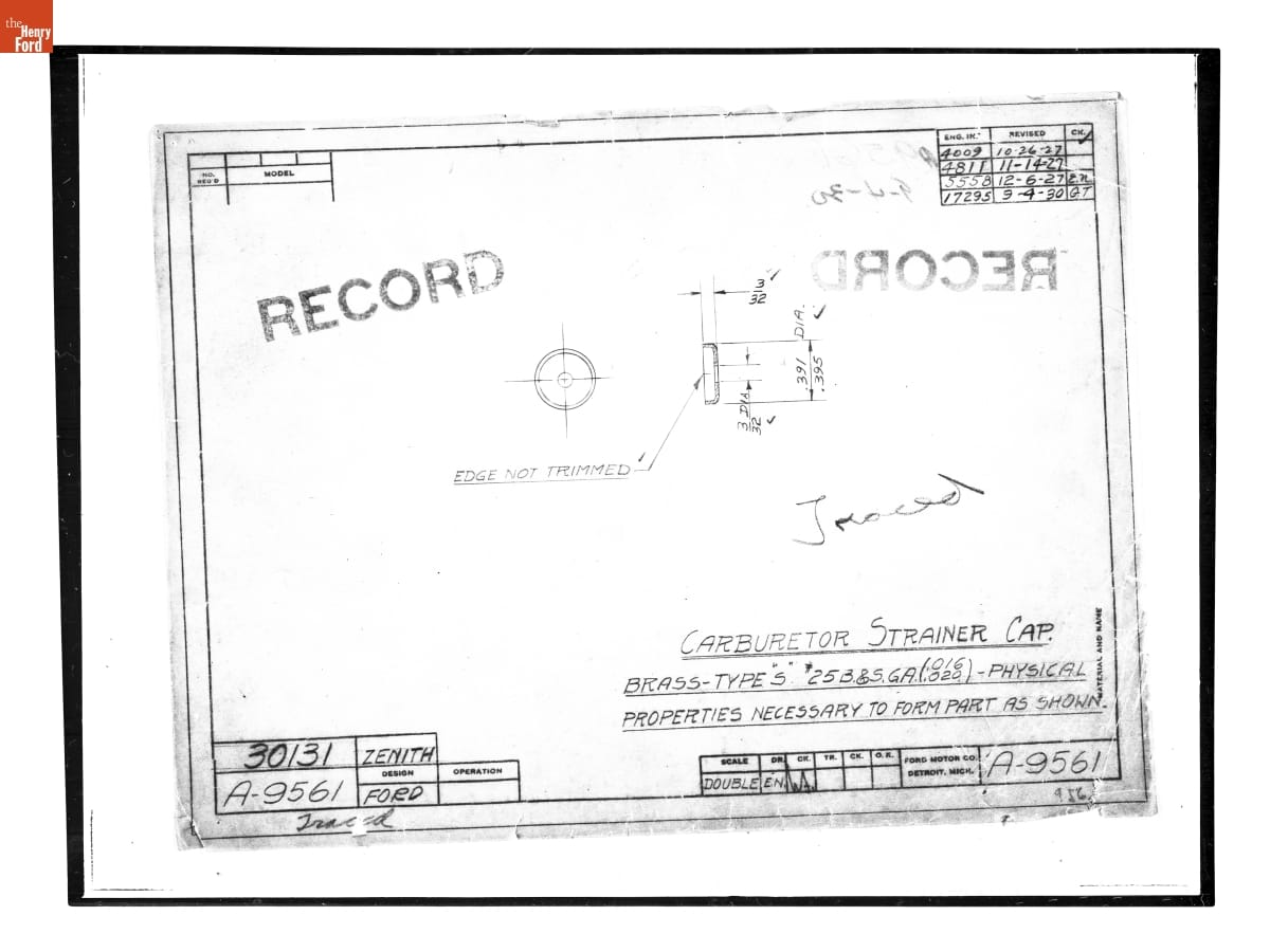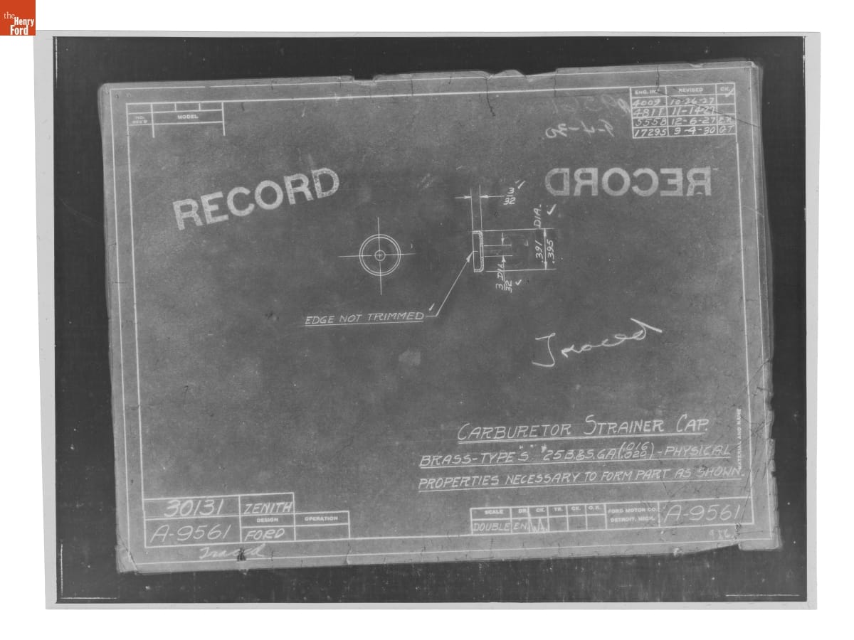 The Ford Motor Company created over a million parts drawings from 1903 to 1957. Many of these drawings specify engineering requirements for the components of Ford-made vehicles--including automobiles, trucks, tractors, military vehicles and Tri-motor airplanes. Others document assembly components, stages of casting and forging, or experimental designs. Beginning in the 1940s, Ford transferred the drawings to microfilm.