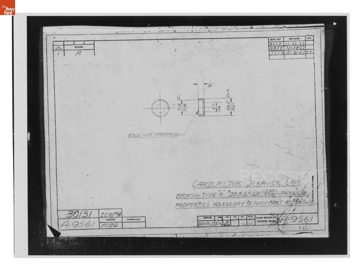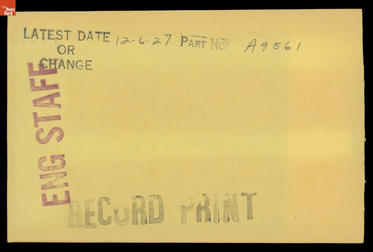 The Ford Motor Company created over a million parts drawings from 1903 to 1957. Many of these drawings specify engineering requirements for the components of Ford-made vehicles--including automobiles, trucks, tractors, military vehicles and Tri-motor airplanes. Others document assembly components, stages of casting and forging, or experimental designs. Beginning in the 1940s, Ford transferred the drawings to microfilm.