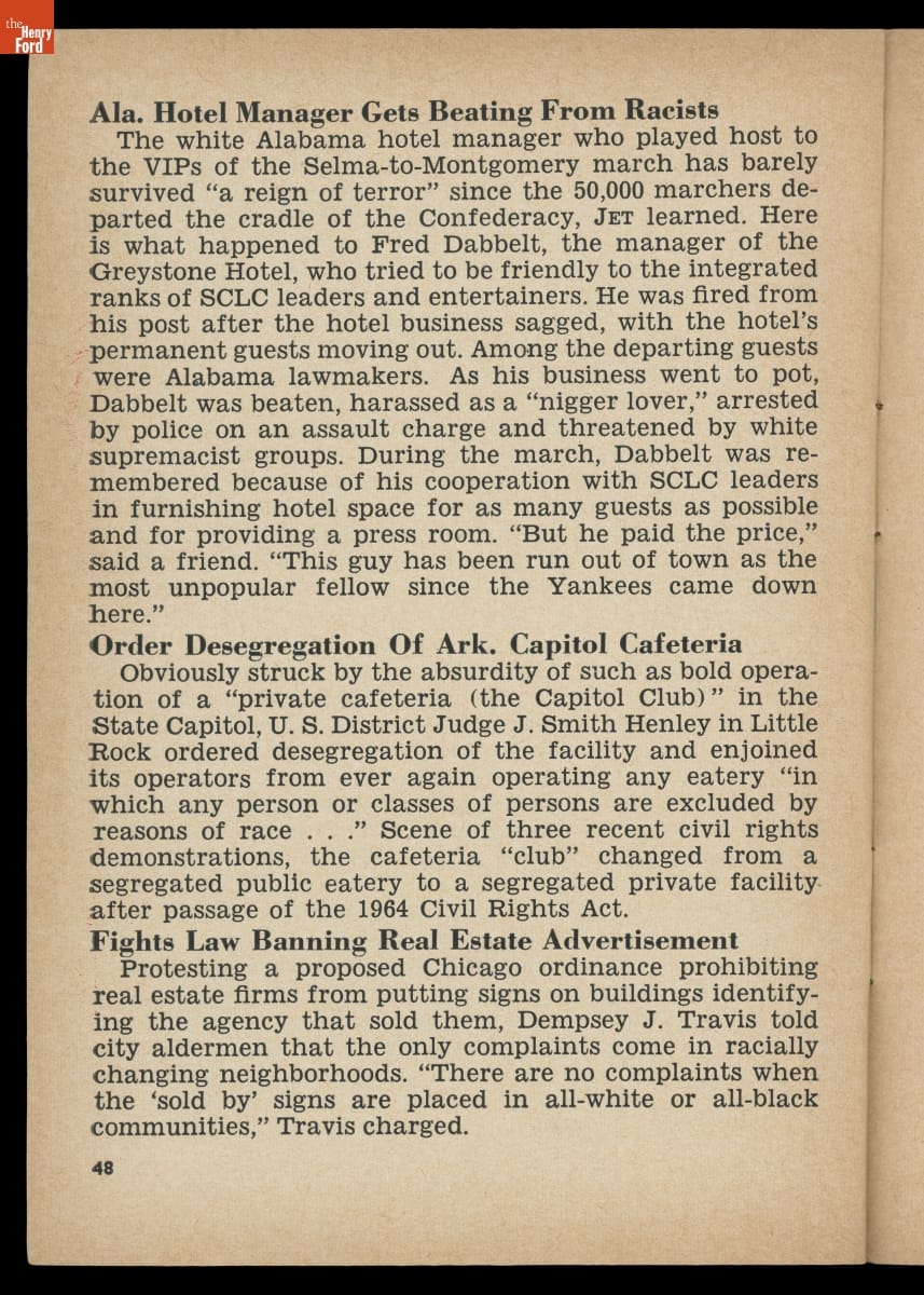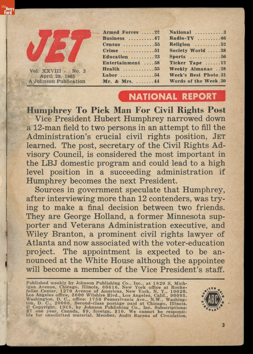 John H. Johnson, head of the Chicago-based Johnson Publishing Company, founded Jet magazine in November 1951. Originally billed as "The Weekly Negro News Magazine," the publication printed news, culture, and entertainment articles related to the African American community. Jet also chronicled the civil rights movement from its earliest years, addressing racial violence and inequality in American society.