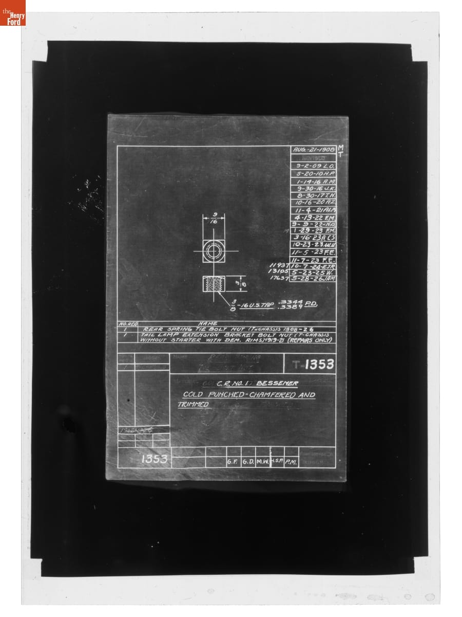 The Ford Motor Company created over a million parts drawings from 1903 to 1957. Many of these drawings specify engineering requirements for the components of Ford-made vehicles--including automobiles, trucks, tractors, military vehicles and Tri-motor airplanes. Others document assembly components, stages of casting and forging, or experimental designs. Beginning in the 1940s, Ford transferred the drawings to microfilm.