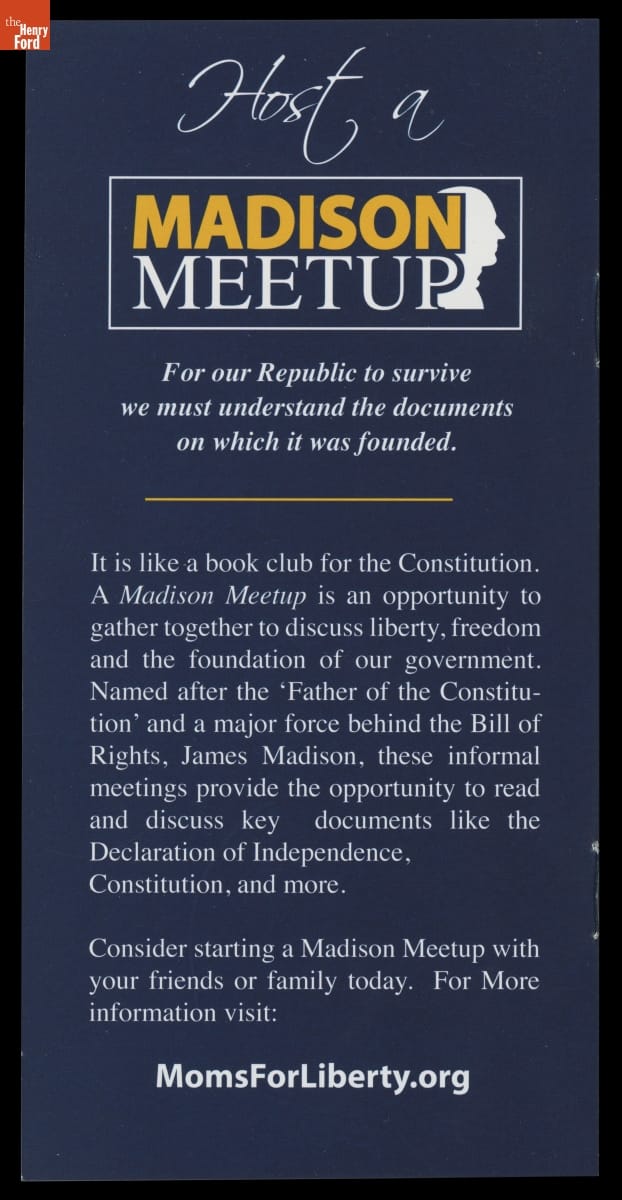 Organizers originally formed Moms for Liberty in 2021 to campaign against COVID-19-related restrictions in schools. The organization later broadened its agenda, empowering parents to defend their rights on other school issues. The organization also promoted Madison Meetups, small group discussions of America's founding documents and what makes the country unique. The organization provides reading materials and facilitator-led talking points.