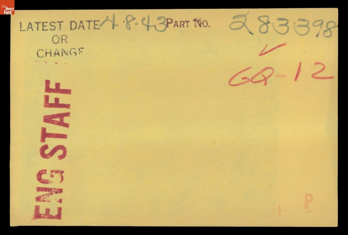 The Ford Motor Company created over a million parts drawings from 1903 to 1957. Many of these drawings specify engineering requirements for the components of Ford-made vehicles--including automobiles, trucks, tractors, military vehicles and Tri-motor airplanes. Others document assembly components, stages of casting and forging, or experimental designs. Beginning in the 1940s, Ford transferred the drawings to microfilm.