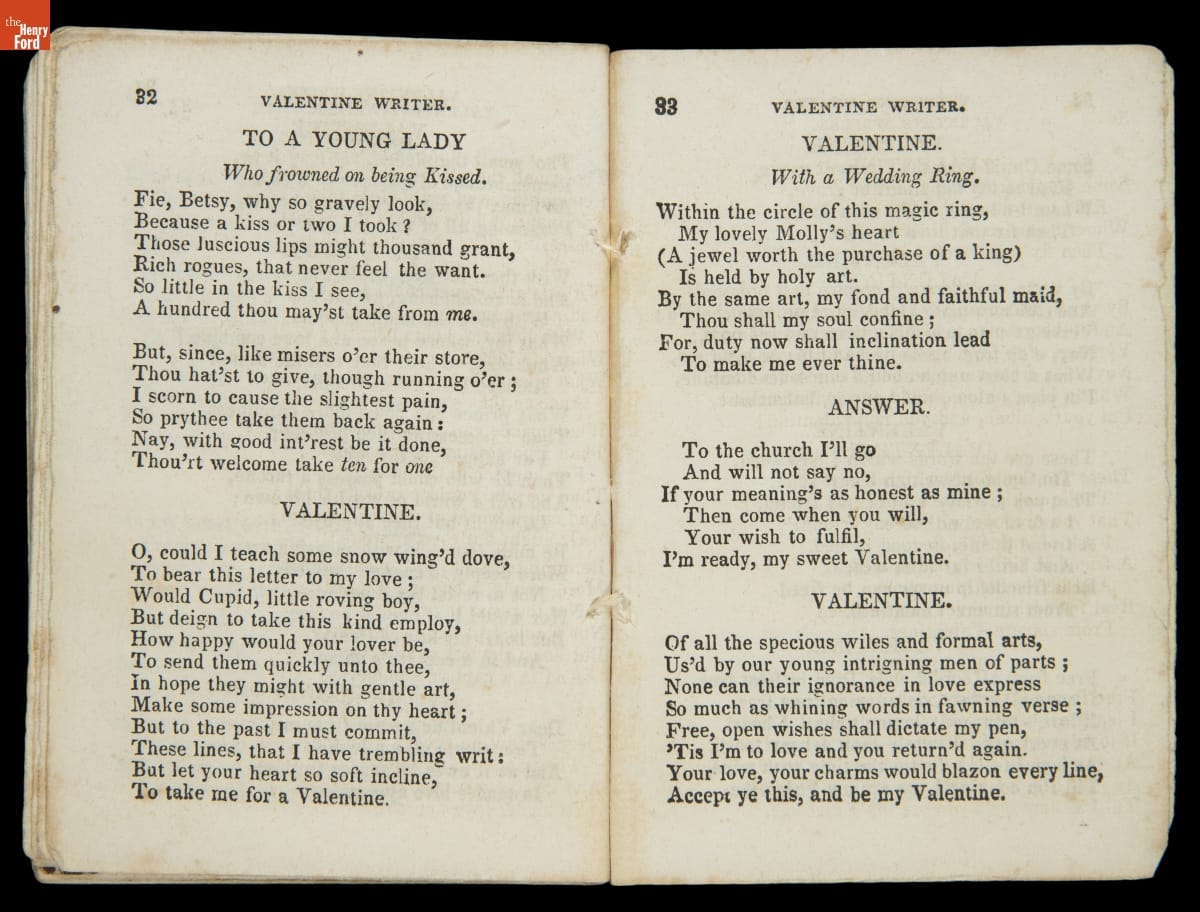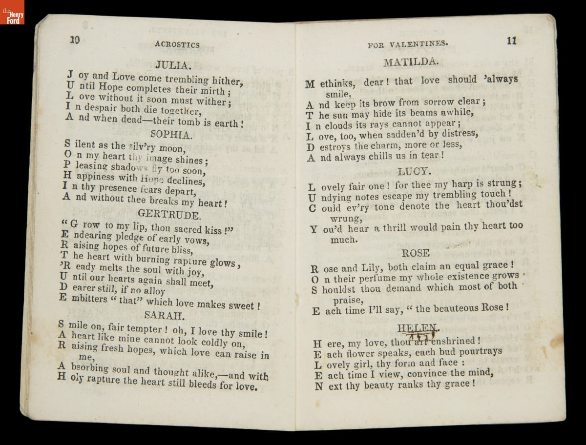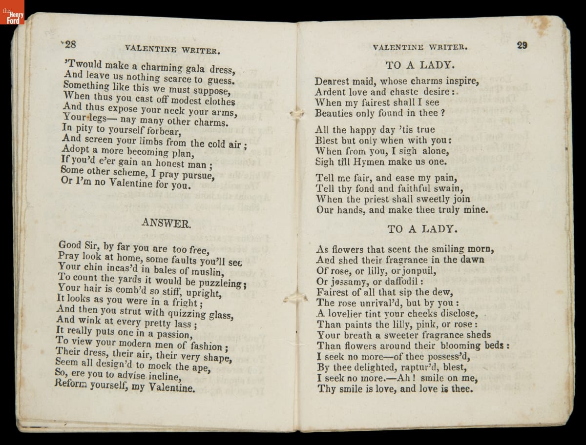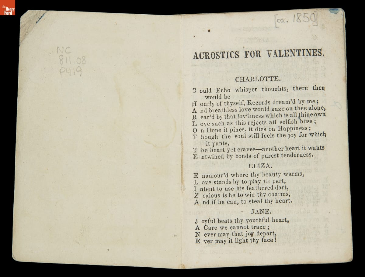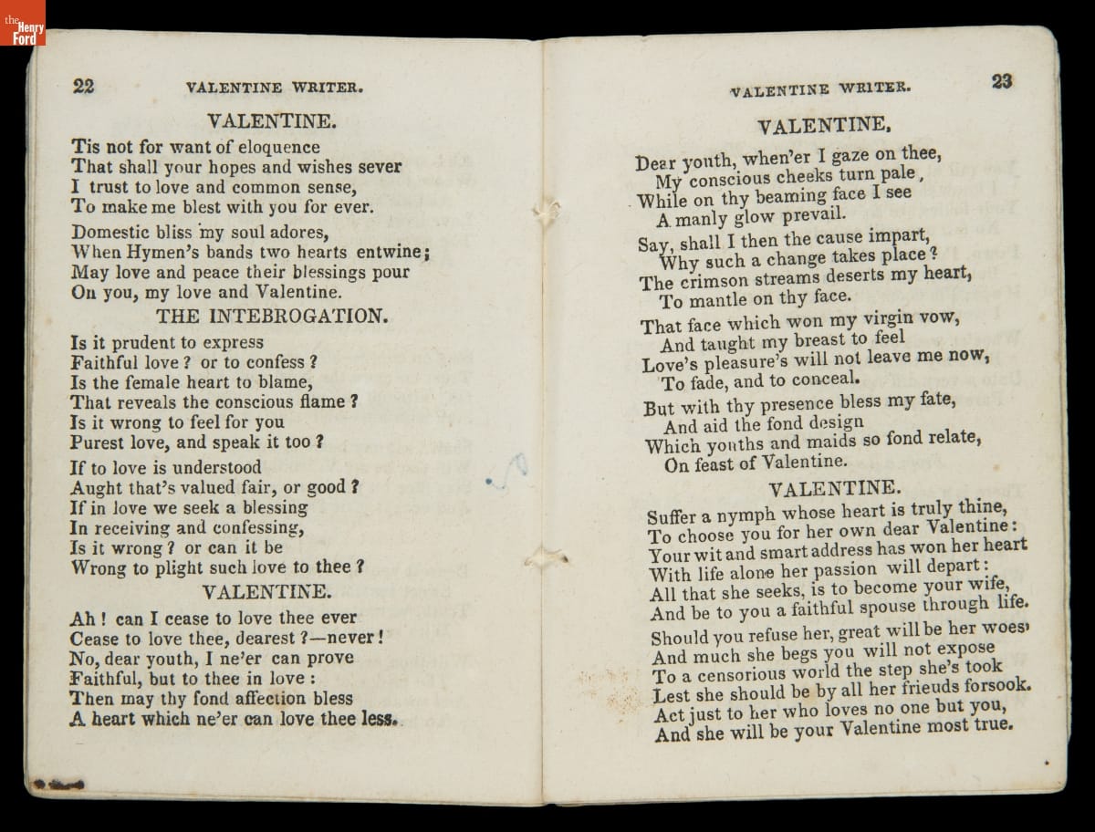 A craze for sending valentines began in America in the immediate decades before the Civil War. Valentines provided a way for young middle-class men and women to express budding feelings of love and to start courting a suitable partner. Valentine writers offered youthful suitors pages of sentimental and sometimes comic poetry to adapt and copy into store-bought or handmade love notes.