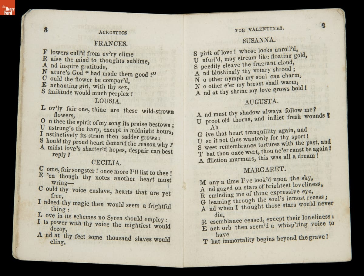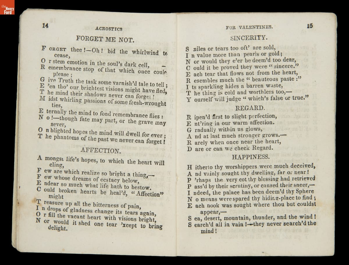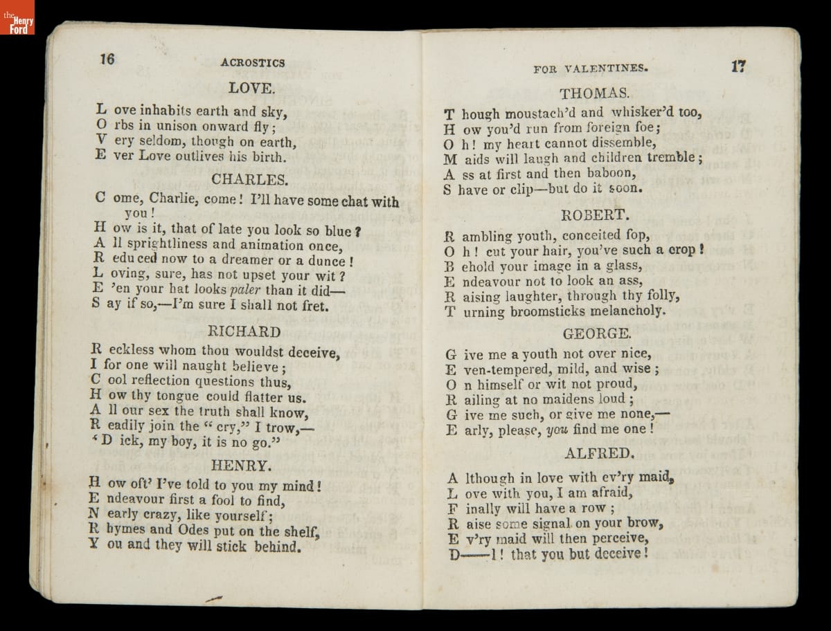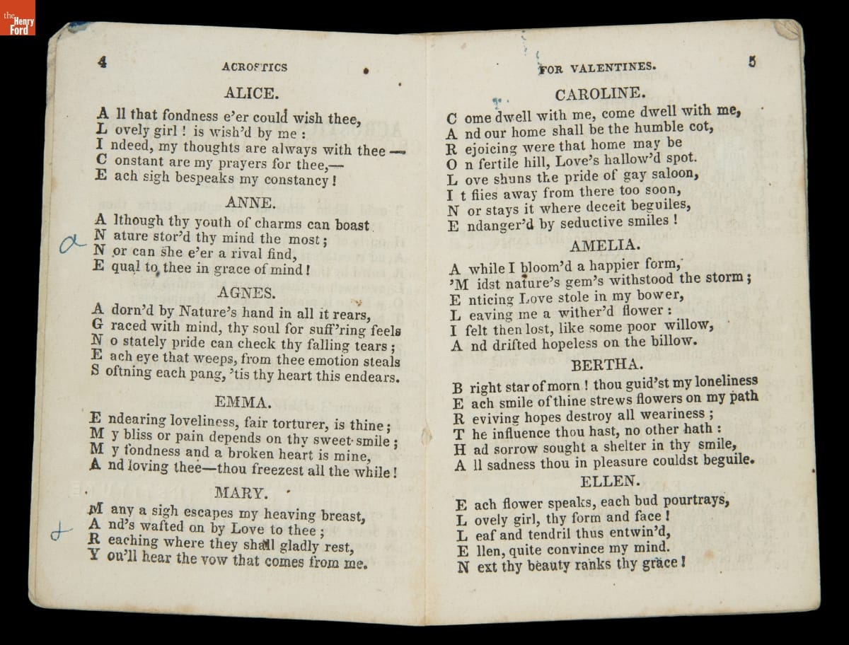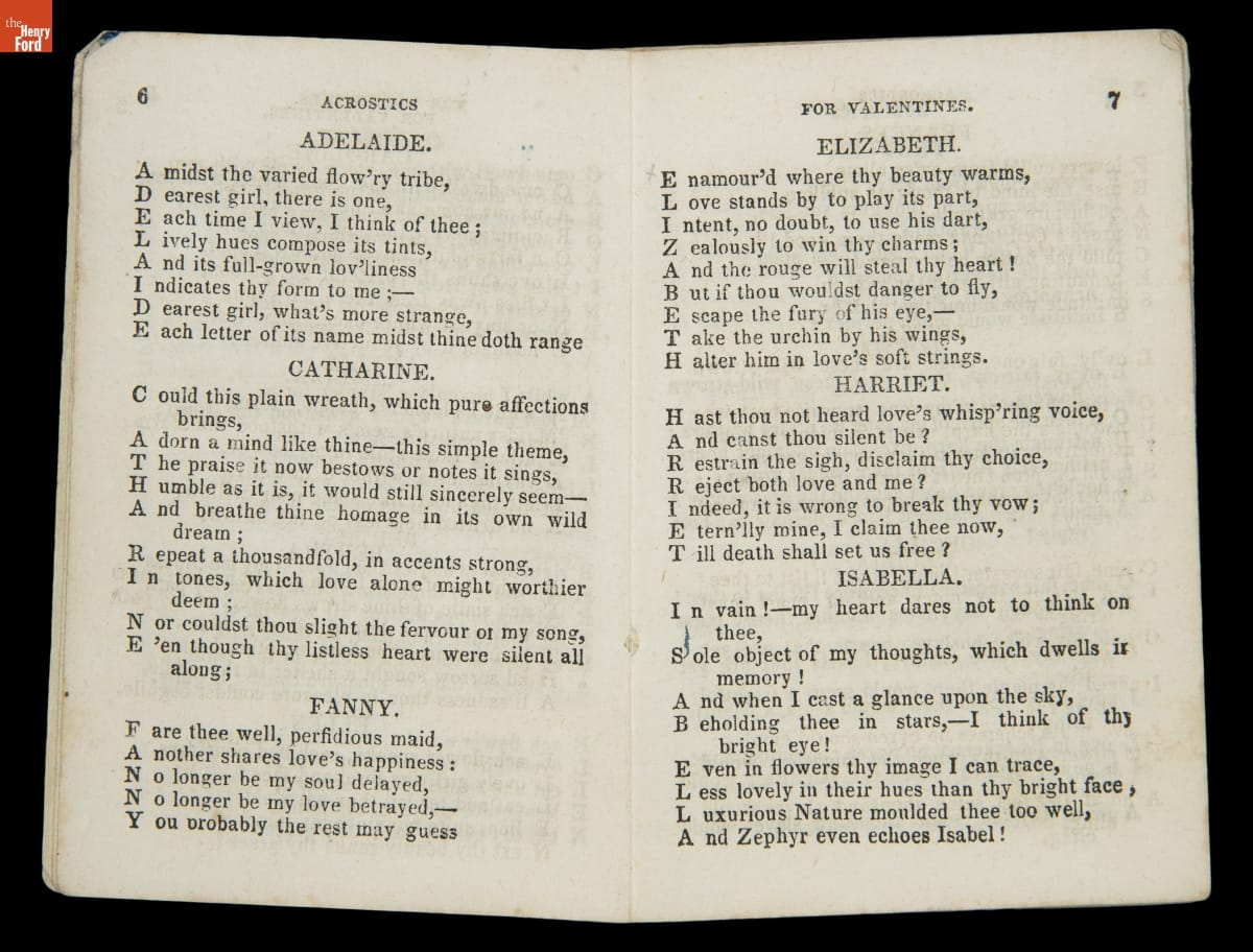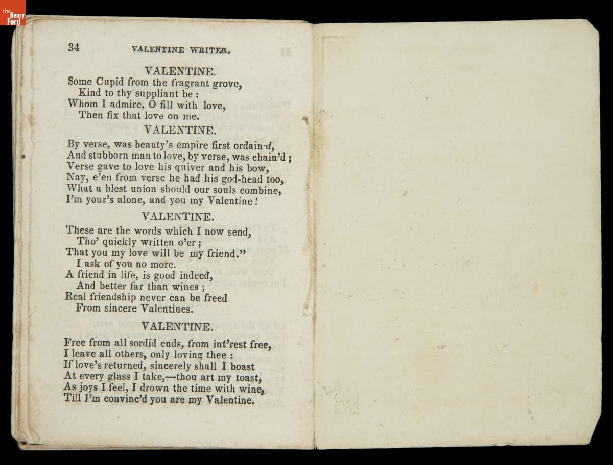 A craze for sending valentines began in America in the immediate decades before the Civil War. Valentines provided a way for young middle-class men and women to express budding feelings of love and to start courting a suitable partner. Valentine writers offered youthful suitors pages of sentimental and sometimes comic poetry to adapt and copy into store-bought or handmade love notes.