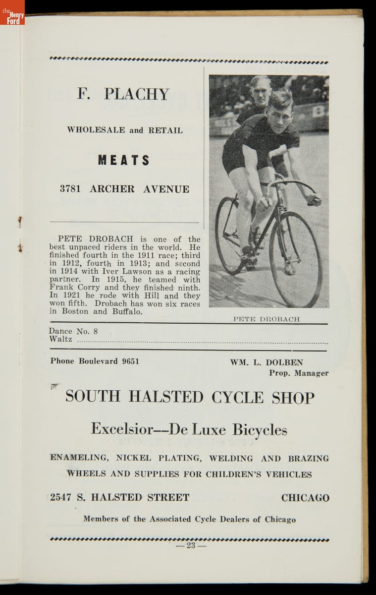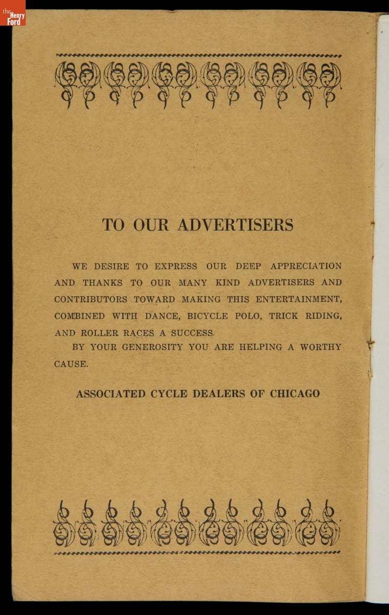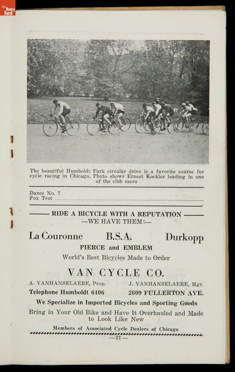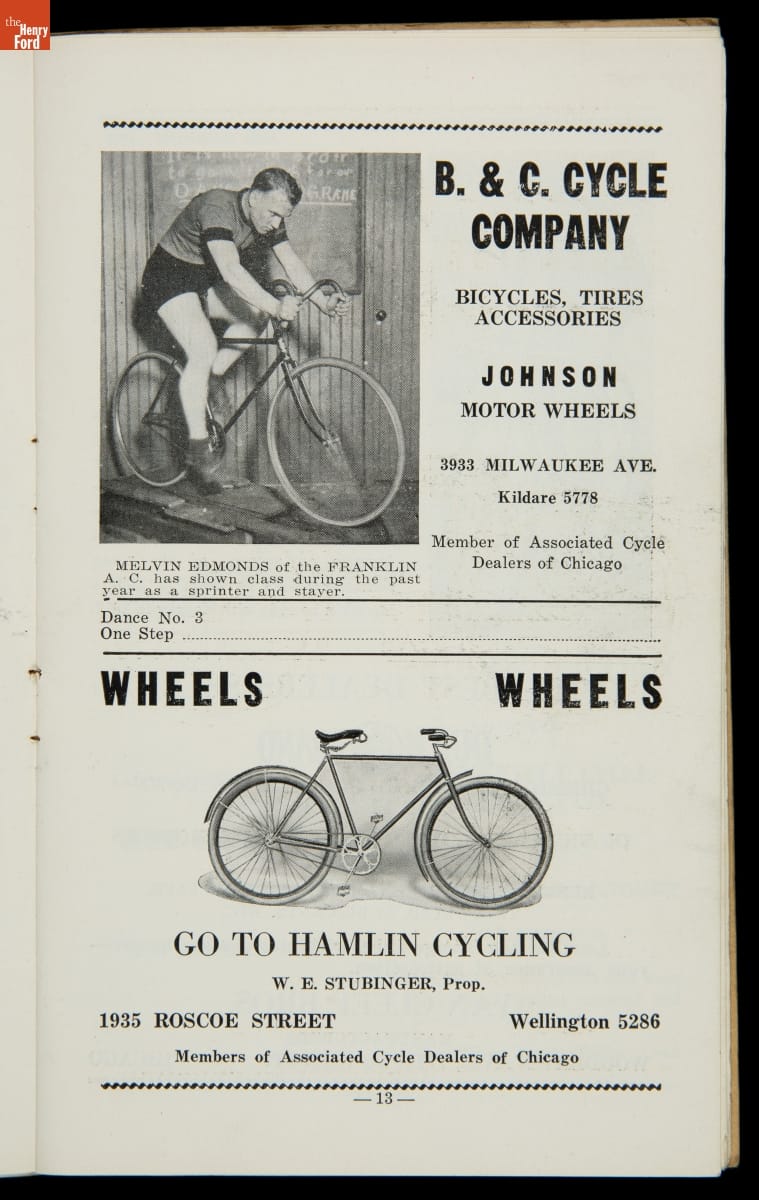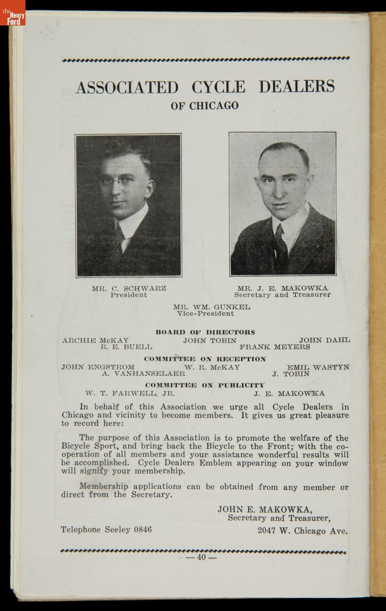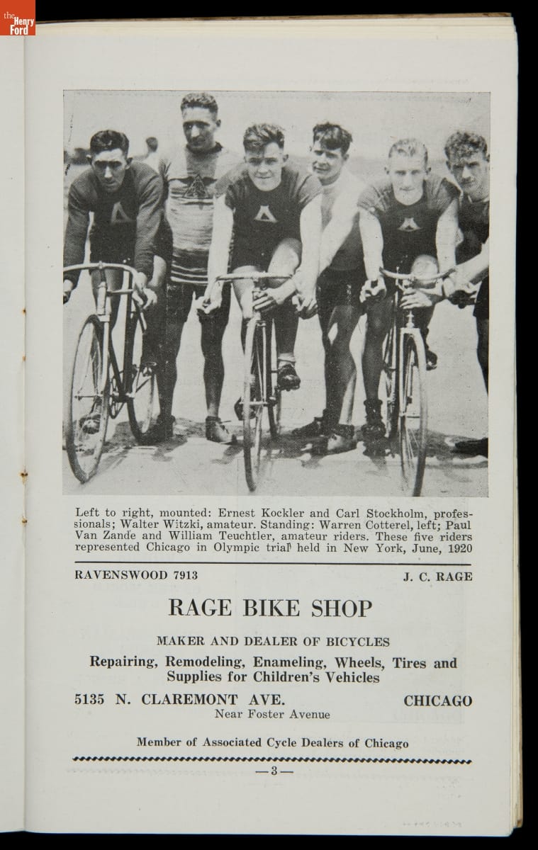 Bicycle races attracted large crowds from the late 19th century well into the 20th. These competitions promoted the cycling industry and encouraged technological development. This yearbook, published in 1940 by the Associated Cycle Dealers of Chicago, contains 40 pages of advertisements, profiles of professional cyclists, and photographs from the greater Chicago area.