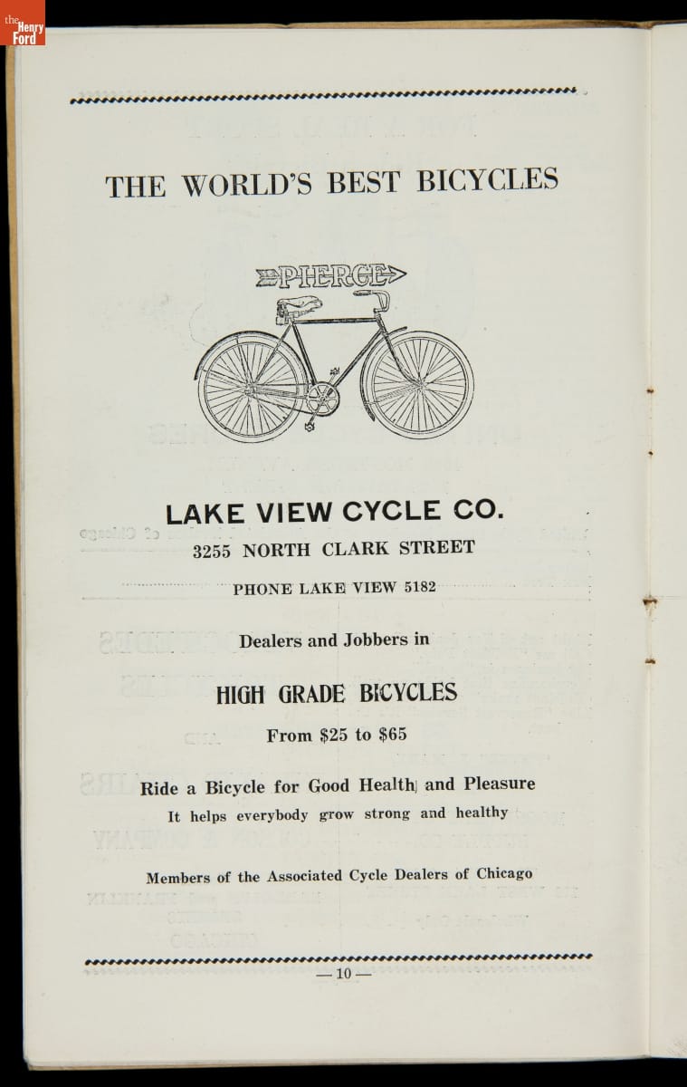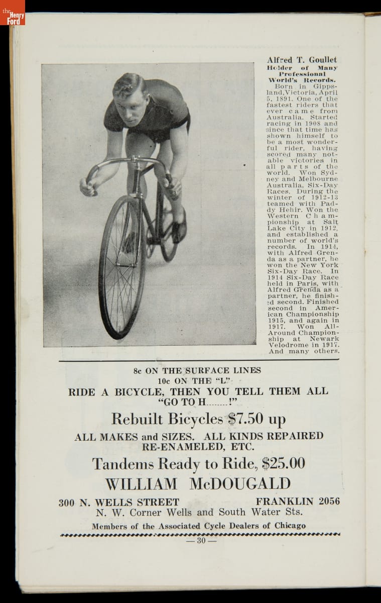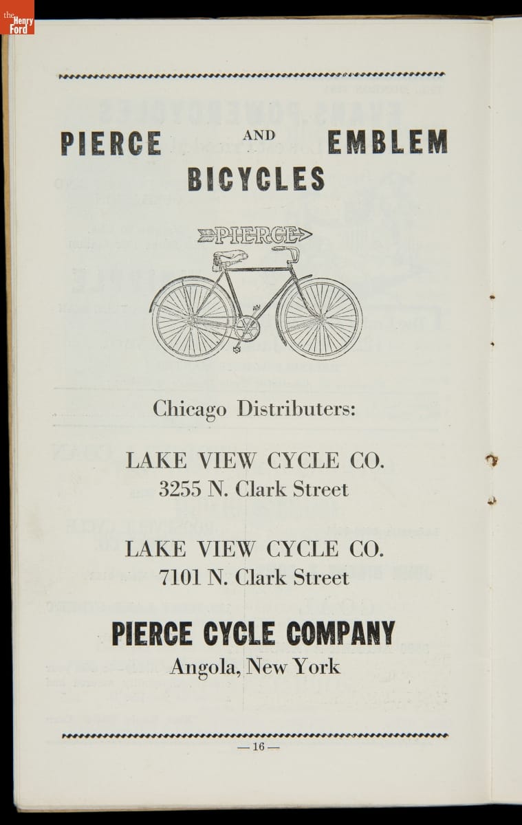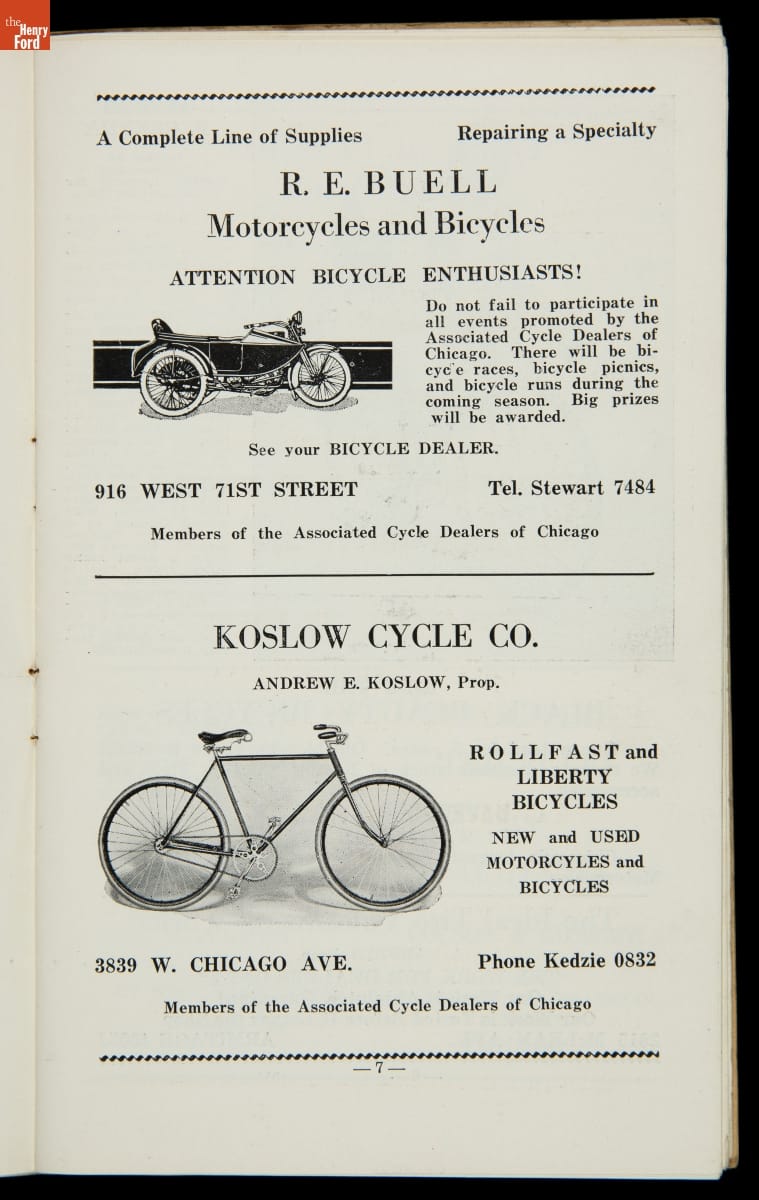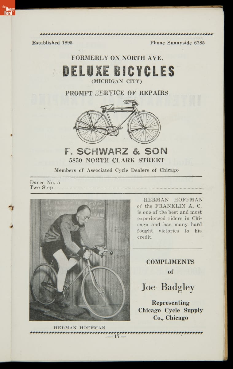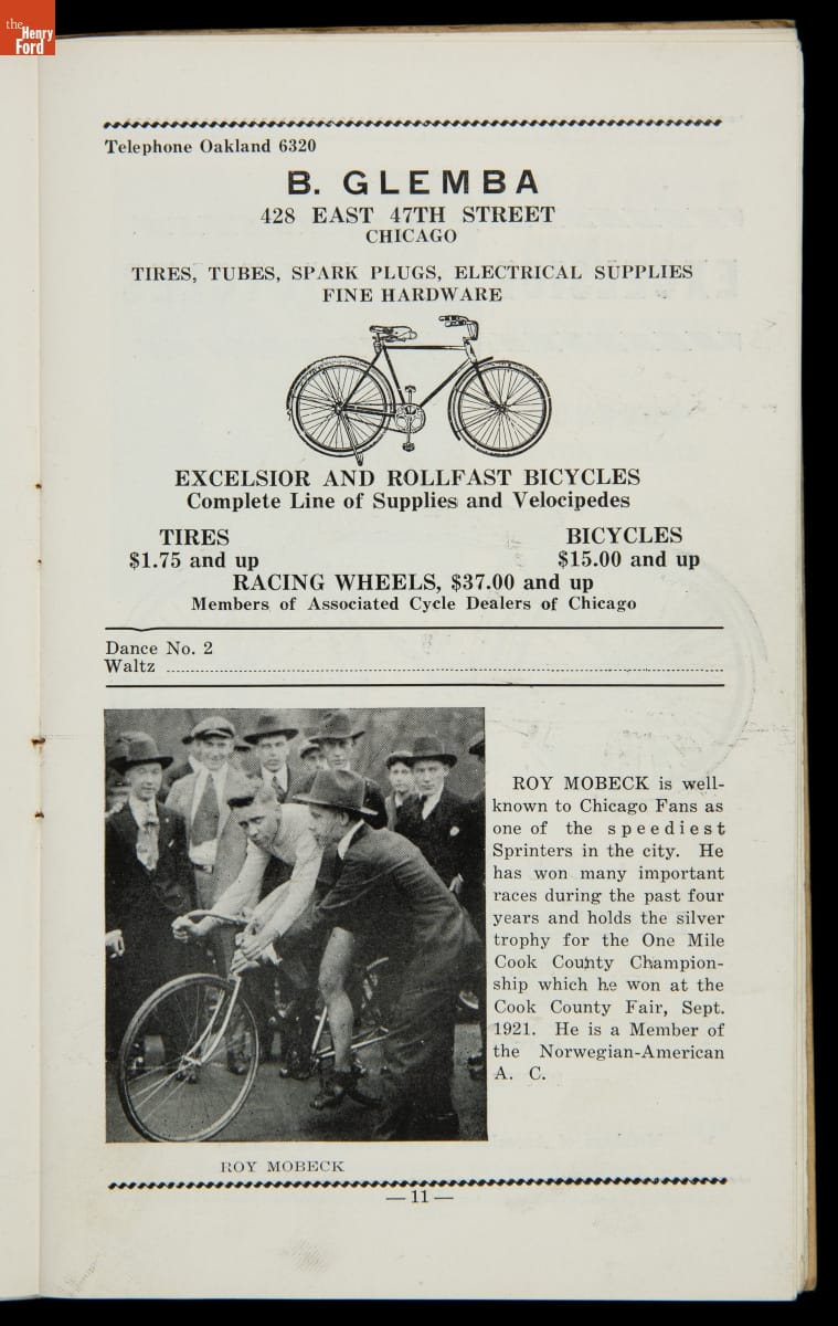 Bicycle races attracted large crowds from the late 19th century well into the 20th. These competitions promoted the cycling industry and encouraged technological development. This yearbook, published in 1940 by the Associated Cycle Dealers of Chicago, contains 40 pages of advertisements, profiles of professional cyclists, and photographs from the greater Chicago area.