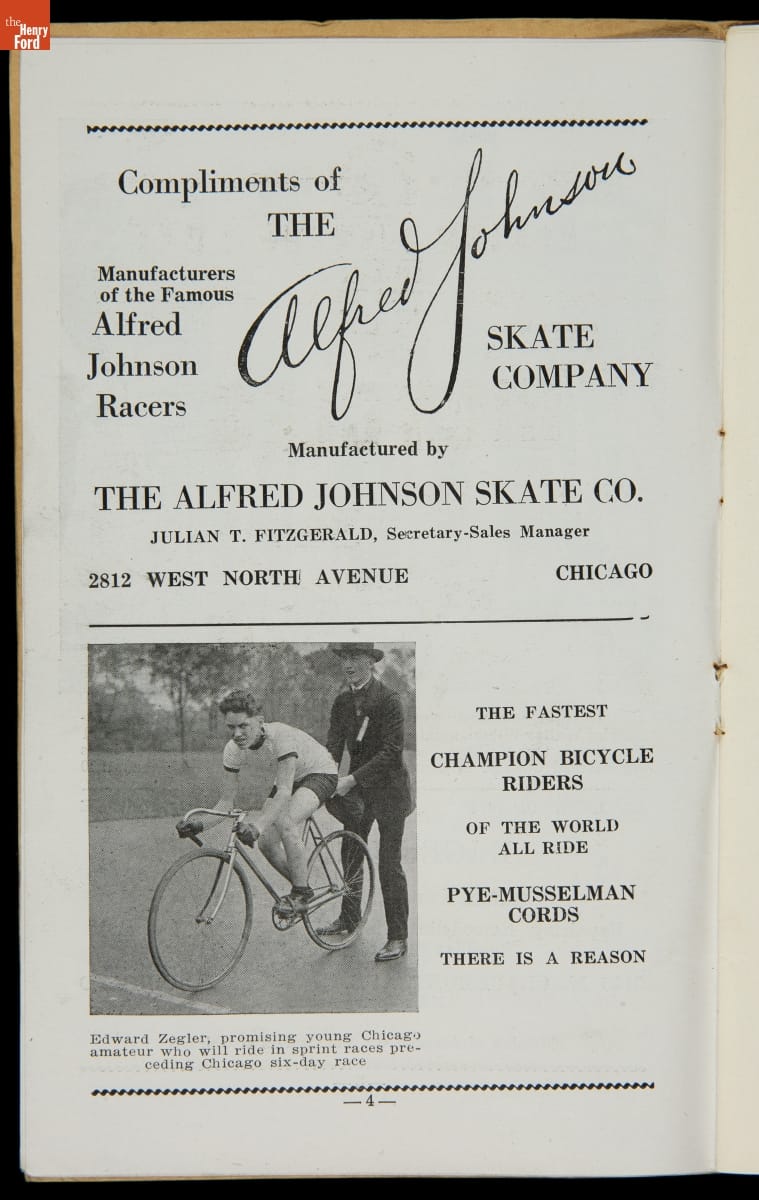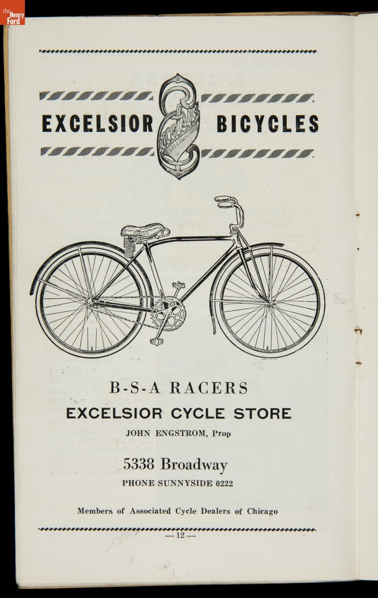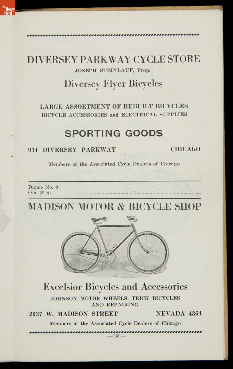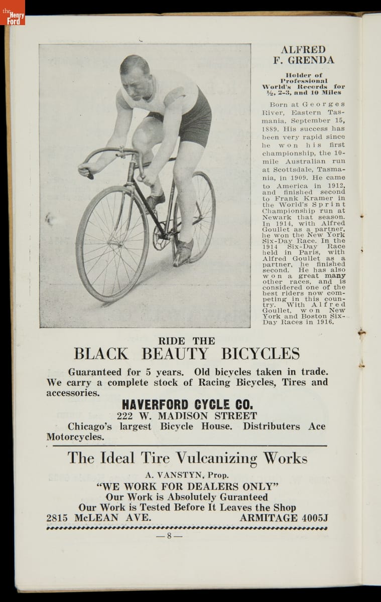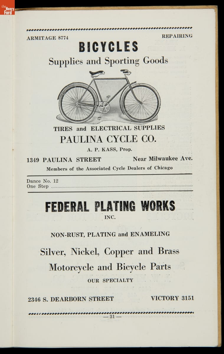 Bicycle races attracted large crowds from the late 19th century well into the 20th. These competitions promoted the cycling industry and encouraged technological development. This yearbook, published in 1940 by the Associated Cycle Dealers of Chicago, contains 40 pages of advertisements, profiles of professional cyclists, and photographs from the greater Chicago area.