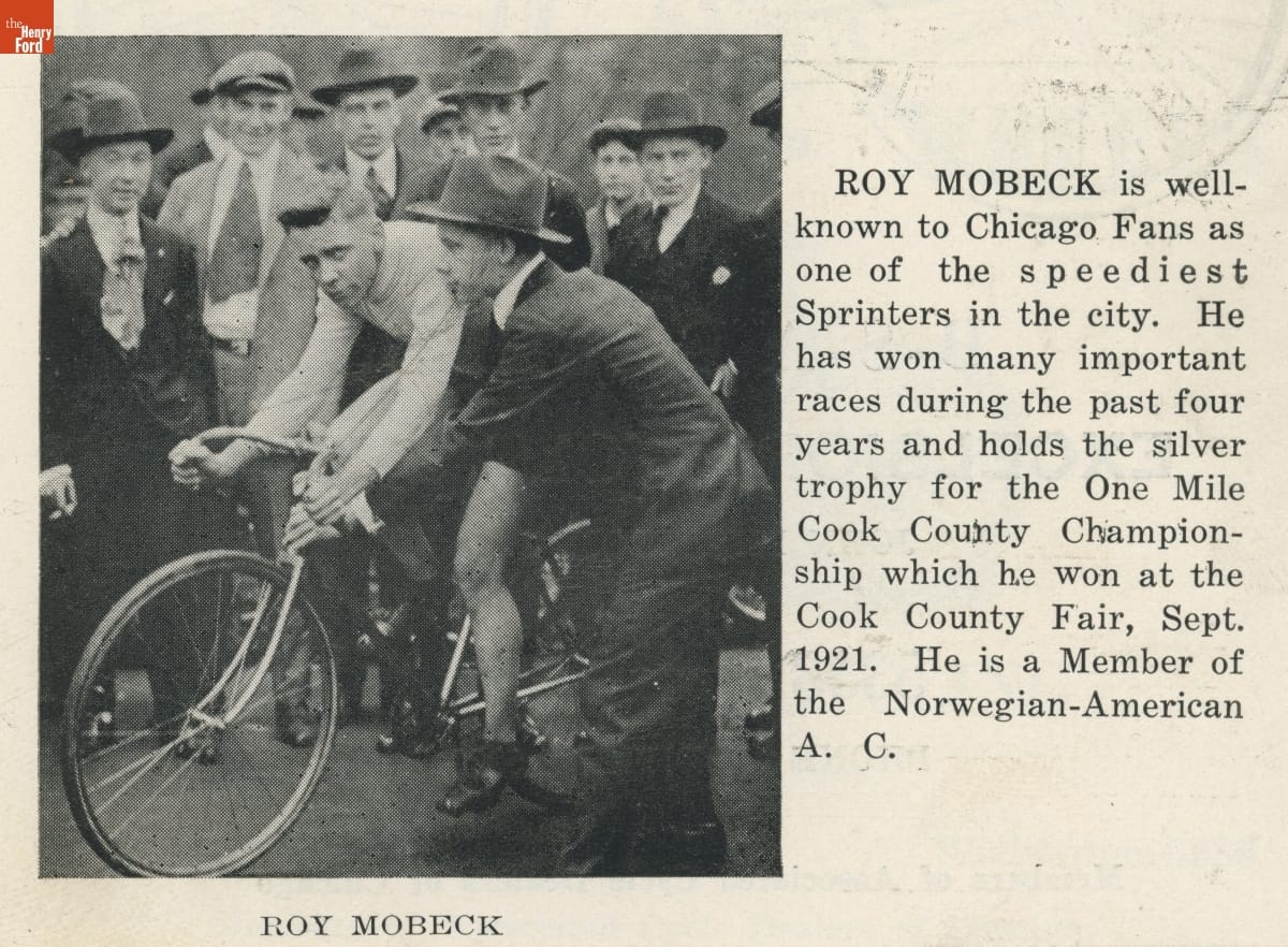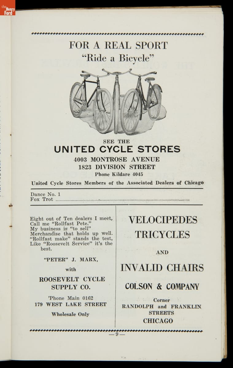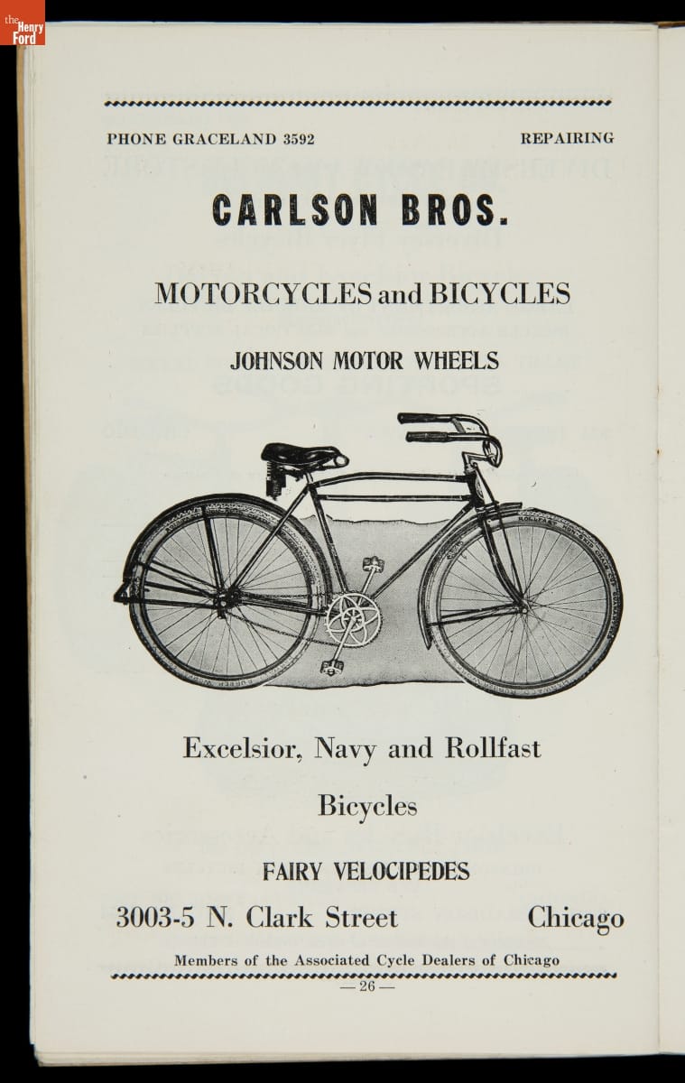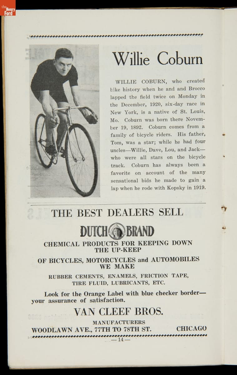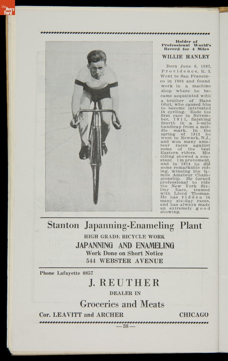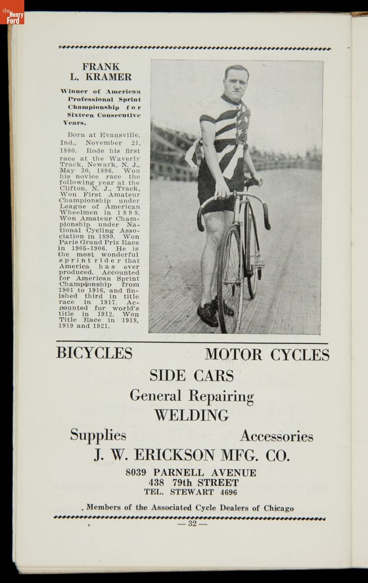 Bicycle races attracted large crowds from the late 19th century well into the 20th. These competitions promoted the cycling industry and encouraged technological development. This yearbook, published in 1940 by the Associated Cycle Dealers of Chicago, contains 40 pages of advertisements, profiles of professional cyclists, and photographs from the greater Chicago area.