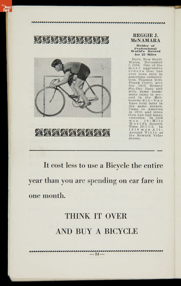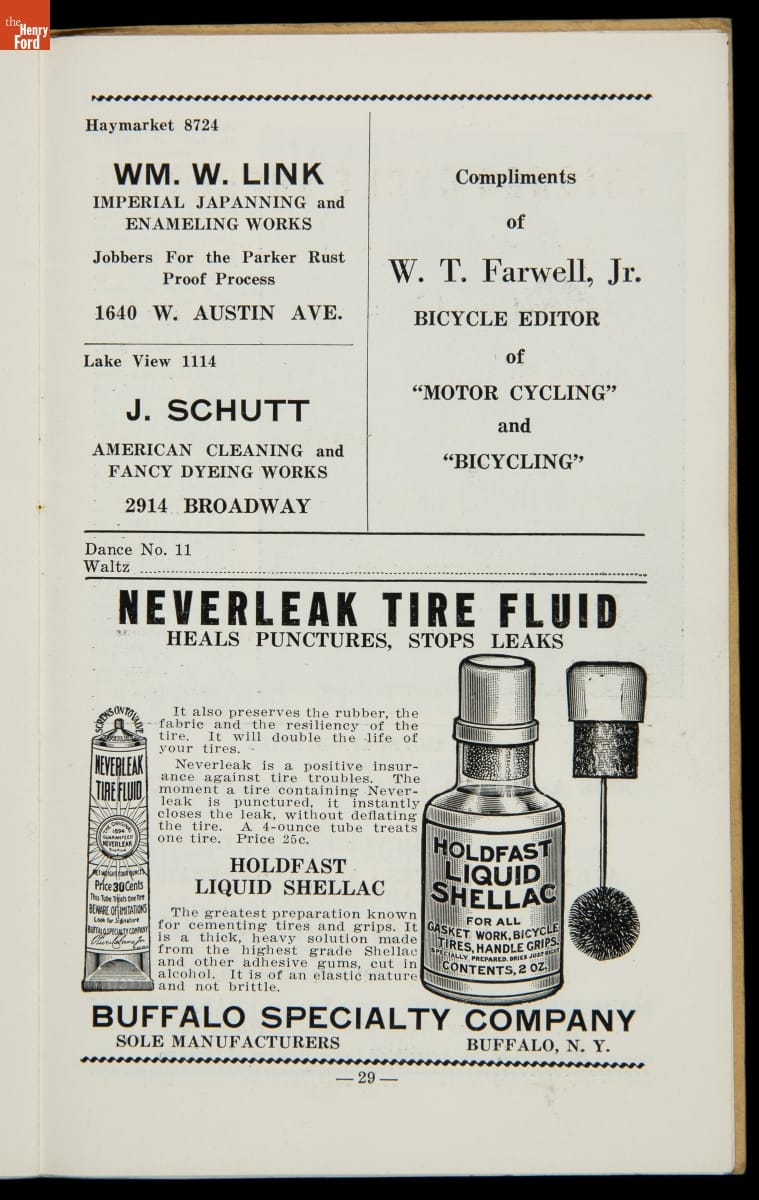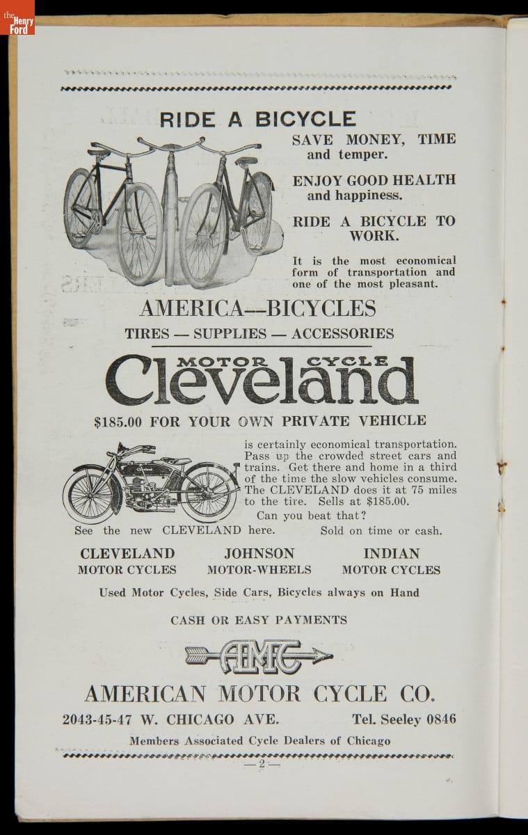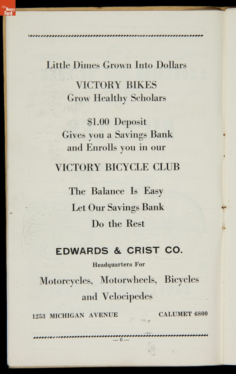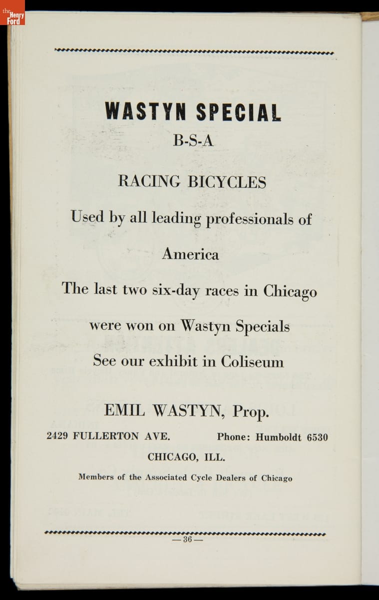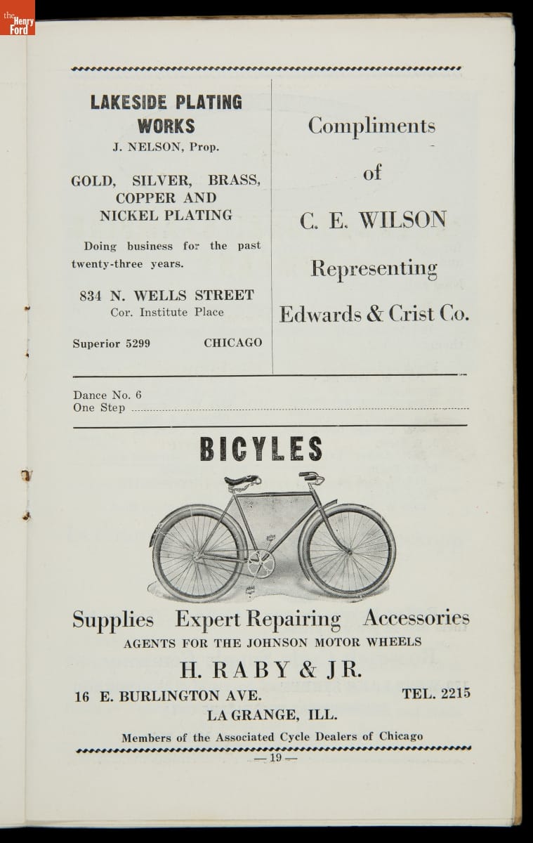Bicycle races attracted large crowds from the late 19th century well into the 20th. These competitions promoted the cycling industry and encouraged technological development. This yearbook, published in 1940 by the Associated Cycle Dealers of Chicago, contains 40 pages of advertisements, profiles of professional cyclists, and photographs from the greater Chicago area.