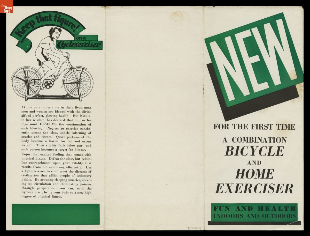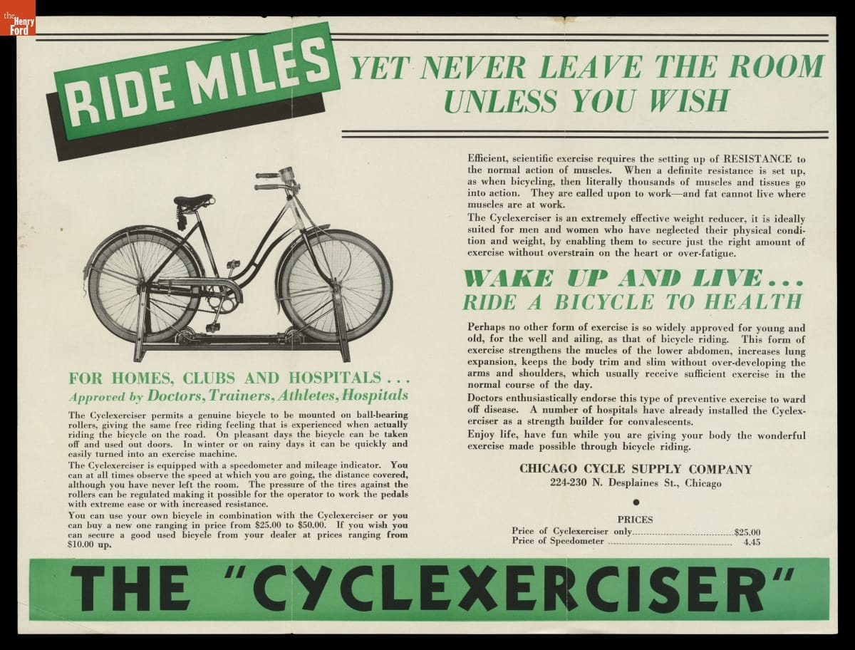 Bicycles provide health benefits to regular riders, but not everyone wants to bike in wet weather or through wintertime snow and ice. Chicago Cycle Supply Company manufactured a "Cyclexerciser" that turned any bicycle into a stationary exercise bike. The device, which mounted a conventional bicycle on ball-bearing rollers, was based on a patent by professional cyclist Roy Mobeck.