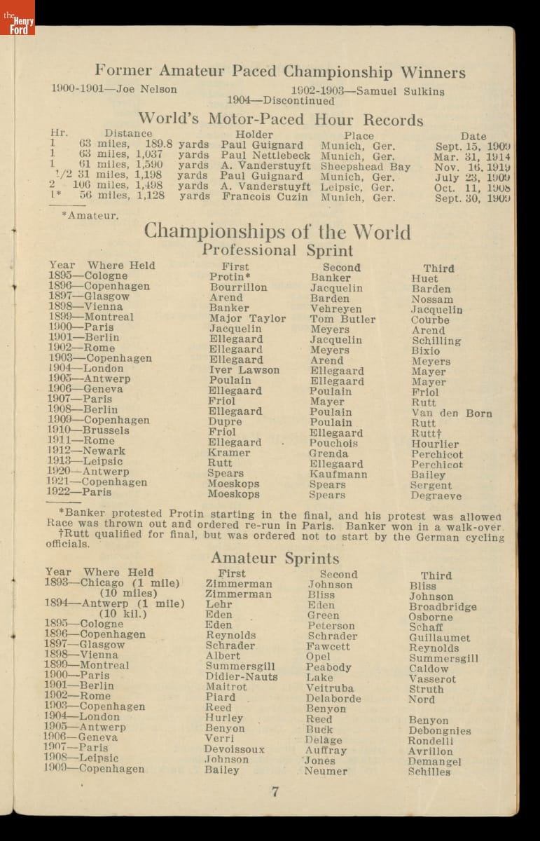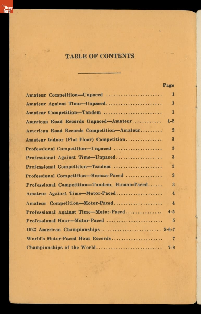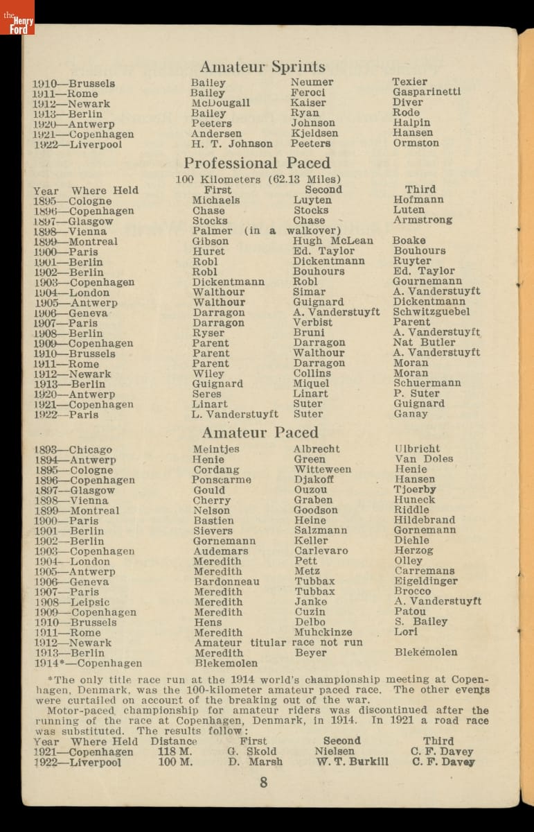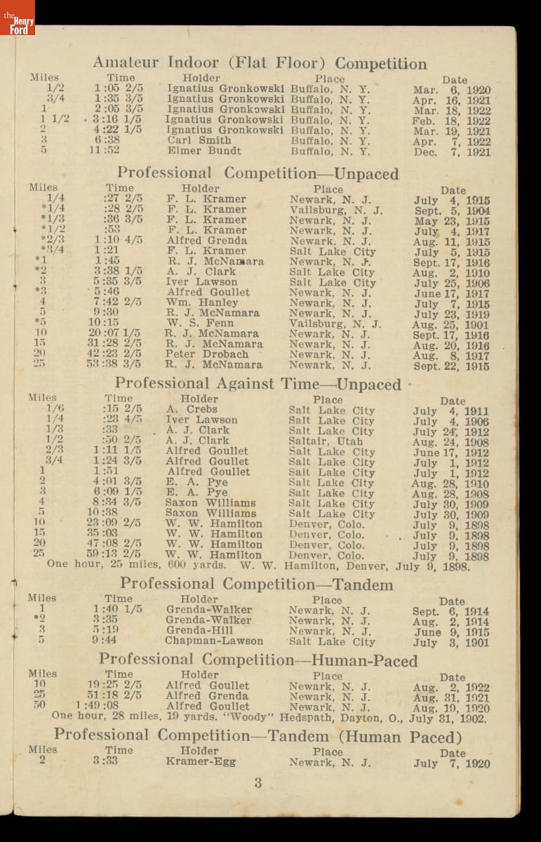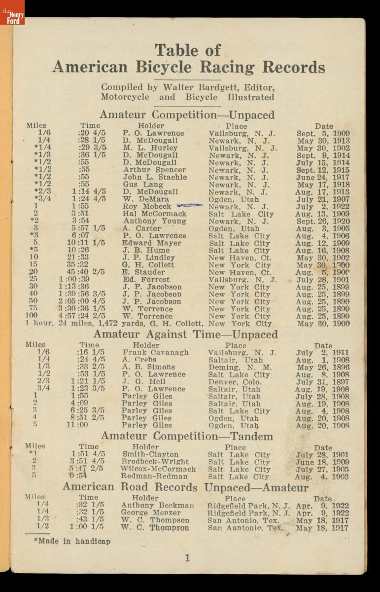 Bicycle races attracted large crowds from the late 19th century well into the 20th. These competitions promoted the cycling industry and encouraged technological development. This booklet contains eight pages of amateur and professional speed records, championship winners, and major-contest victors. Though the booklet was published in 1923, its "up-to-the-minute" records were only current through 1922.