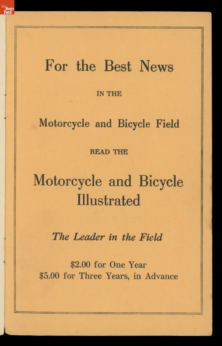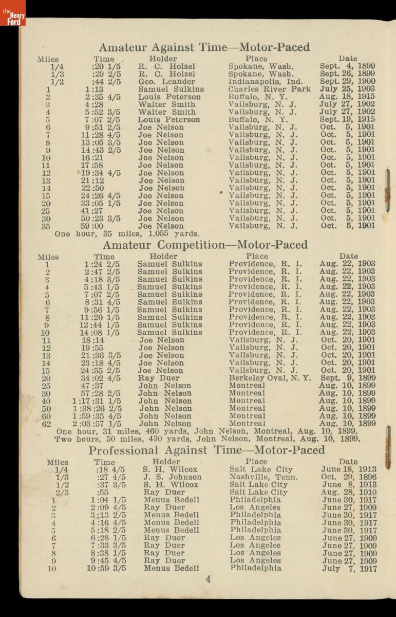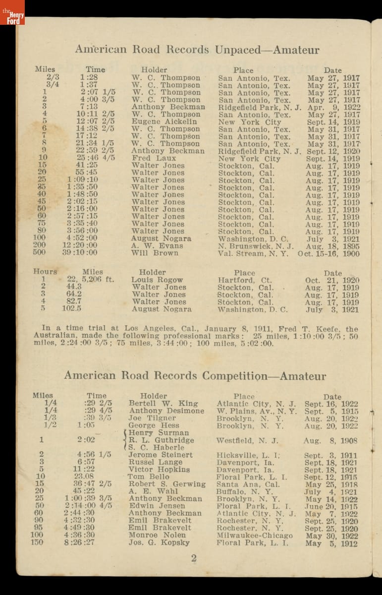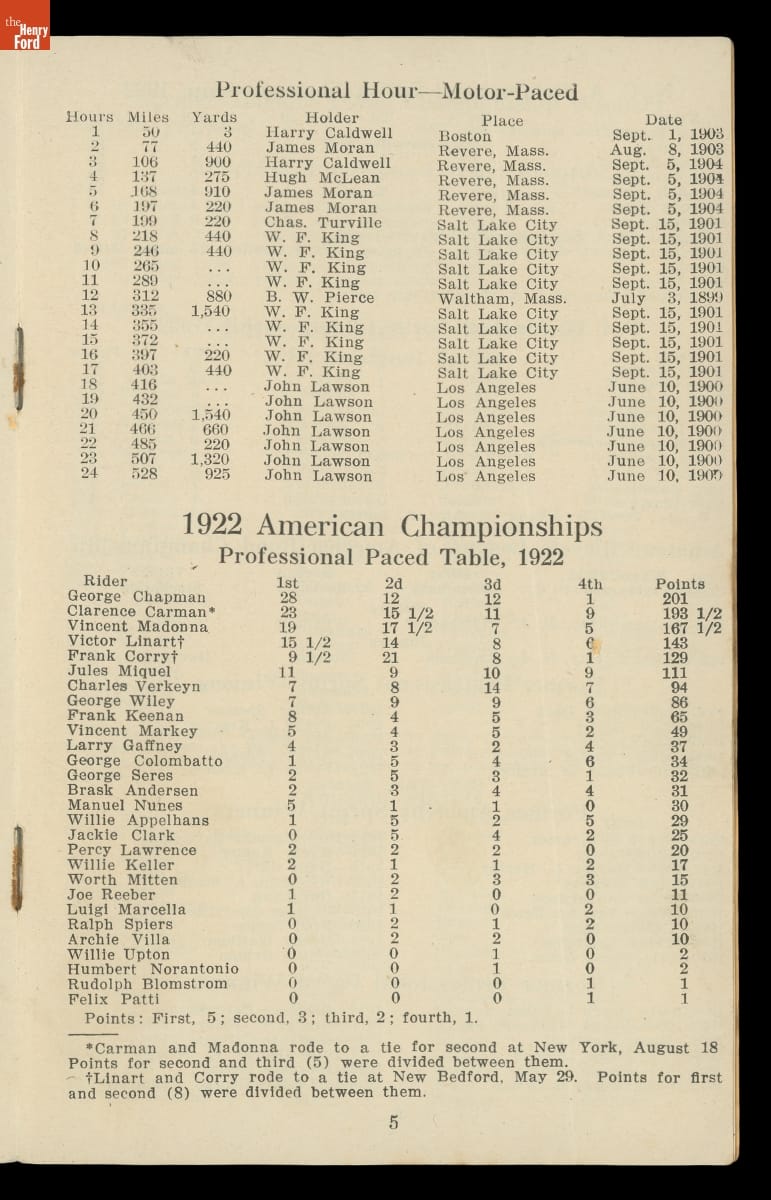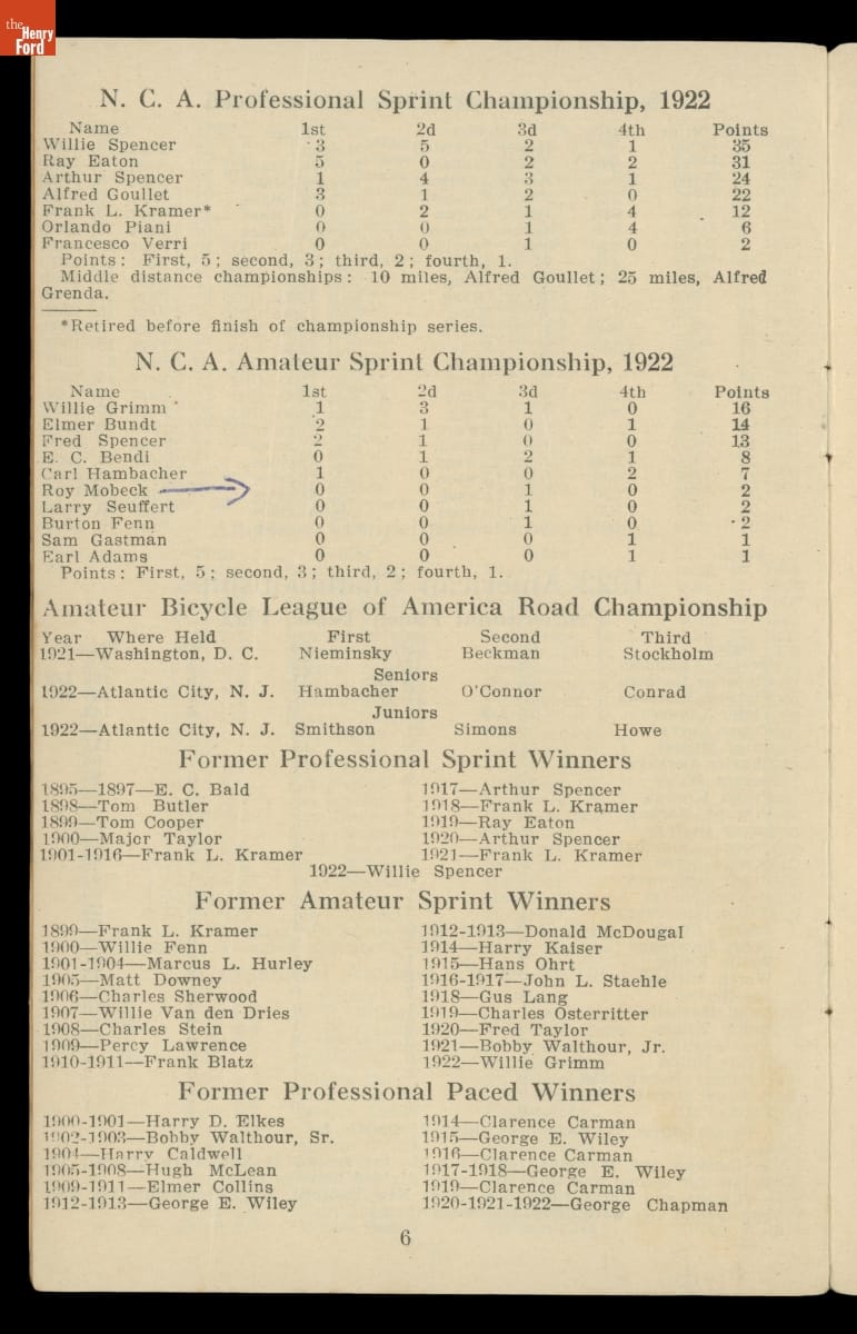 Bicycle races attracted large crowds from the late 19th century well into the 20th. These competitions promoted the cycling industry and encouraged technological development. This booklet contains eight pages of amateur and professional speed records, championship winners, and major-contest victors. Though the booklet was published in 1923, its "up-to-the-minute" records were only current through 1922.