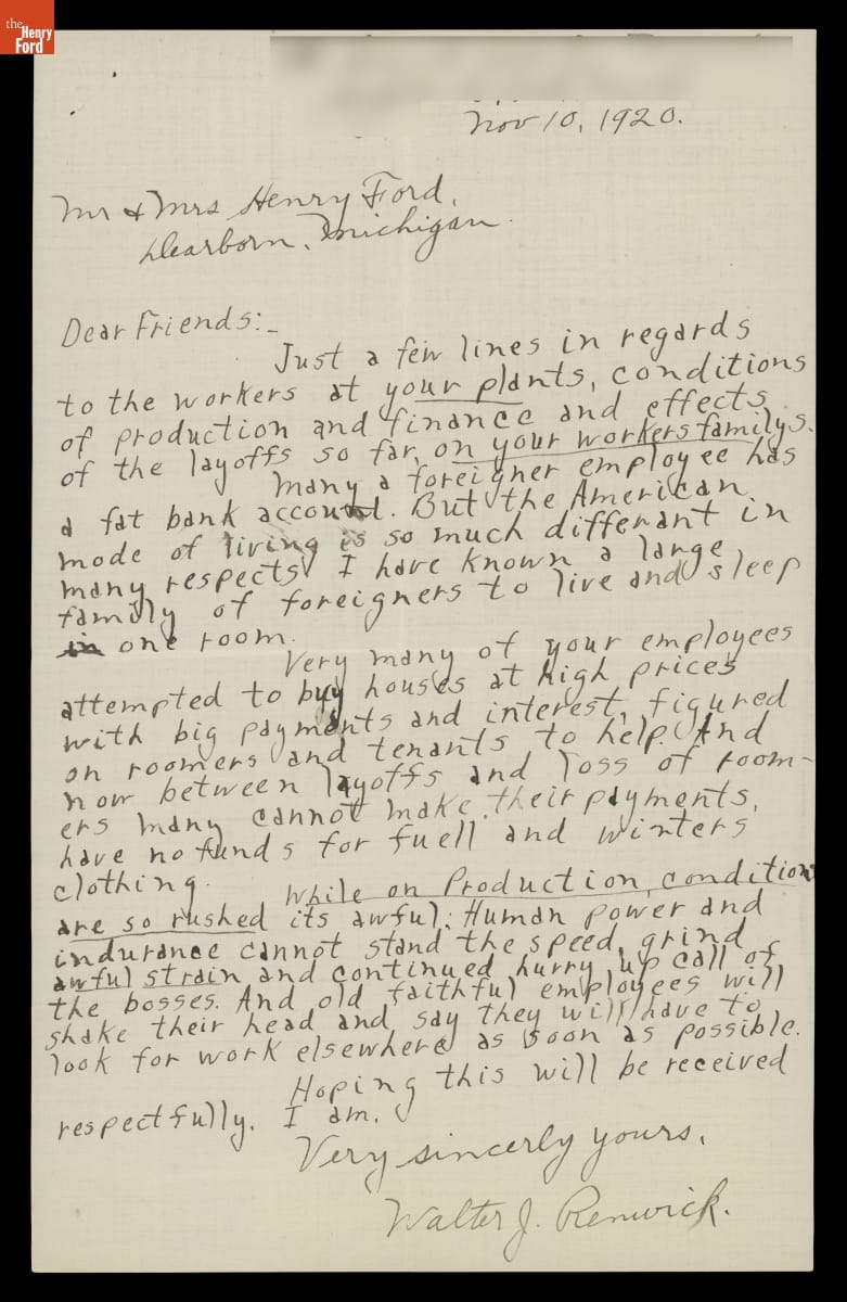 Letter to Henry and Clara Ford from Walter J. Renwick, November 10, 1920
