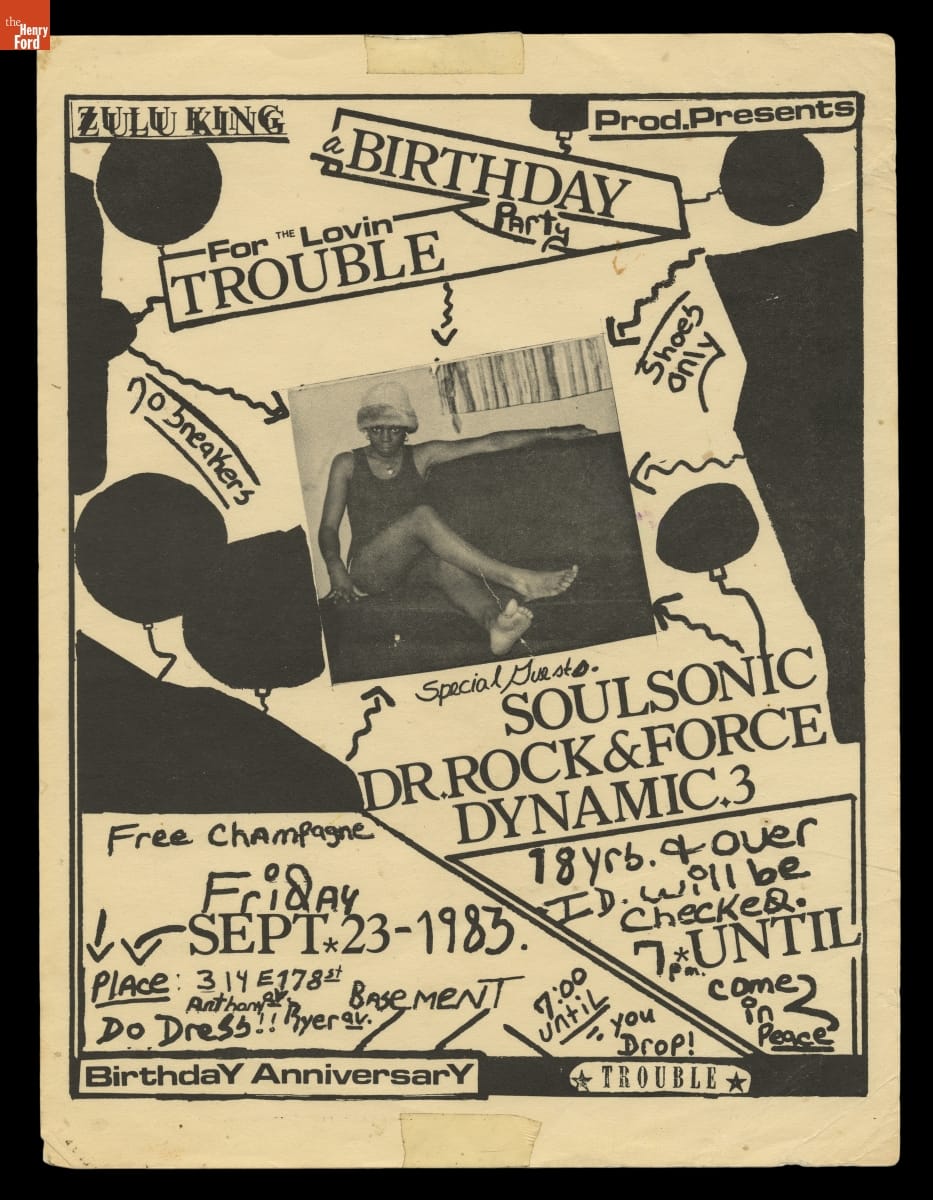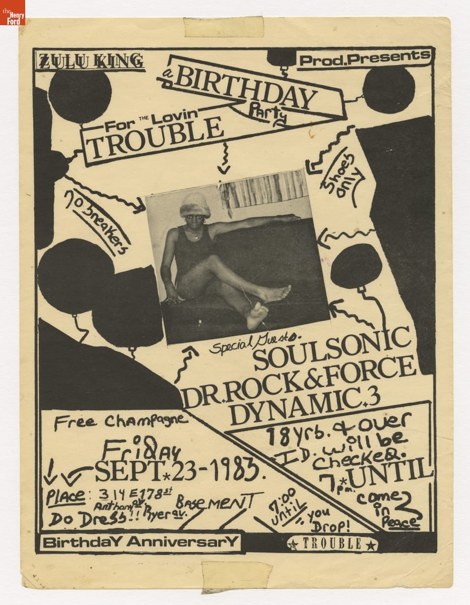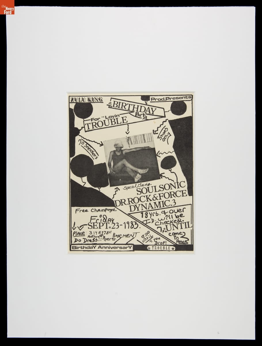 Hip-hop culture developed in the 1970s and 1980s at parties and venues across New York City and its suburbs. Fliers like these advertised these events and often included the names of performing DJs and emcees to build the audience's anticipation. The maker of this flier took design inspiration from the concurrently burgeoning New York street art scene.