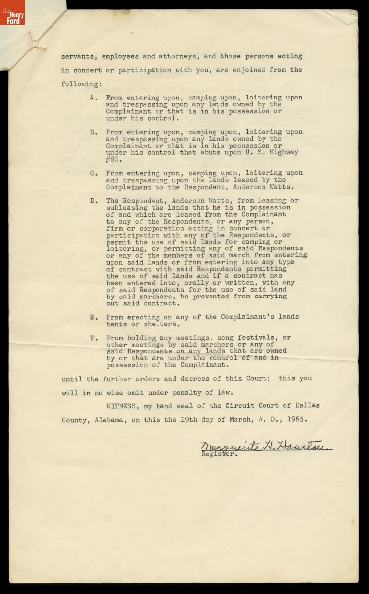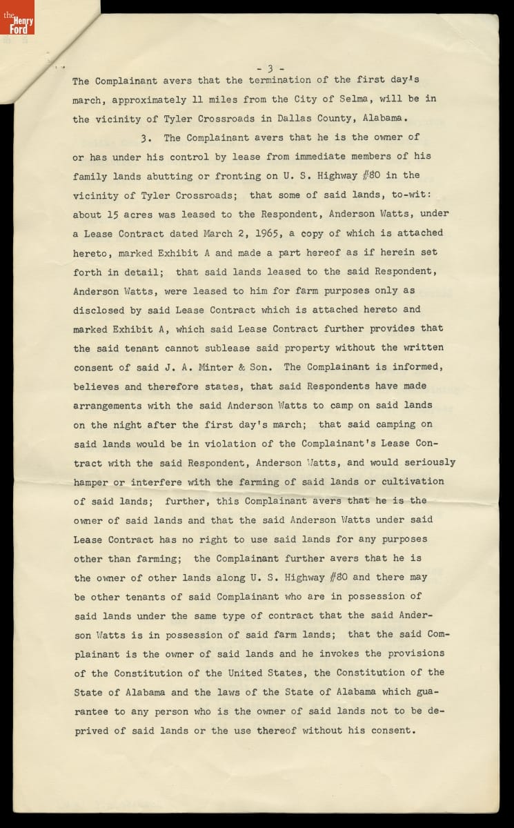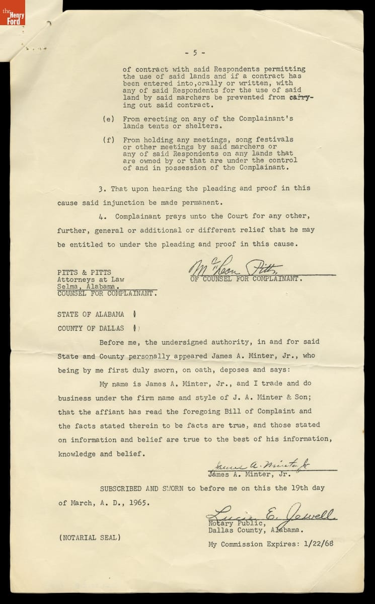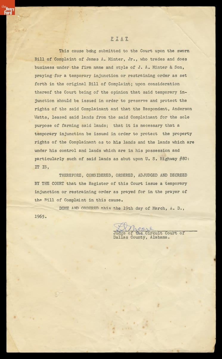Injunction Filed by James A. Minter, Jr. of Selma, Alabama against Voting Rights Protesters on His Land, March 19, 1965